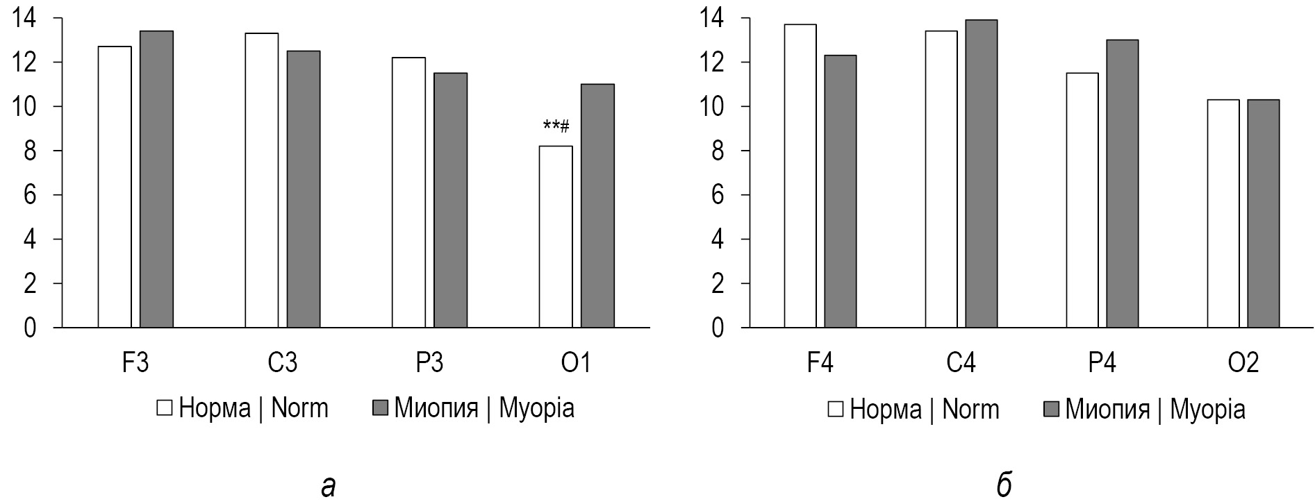 Рис. 1. Распределение показателей переднезатылочного градиента по амплитуде (мкВ) P300 вызванных потенциалов Р300 у здоровых людей и у людей с миопией (мкВ): а — левое полушарие; б — правое полушарие (**p <0,01 между O1 и F3, O1 и C3; #p <0,05 между O1 и P3).
