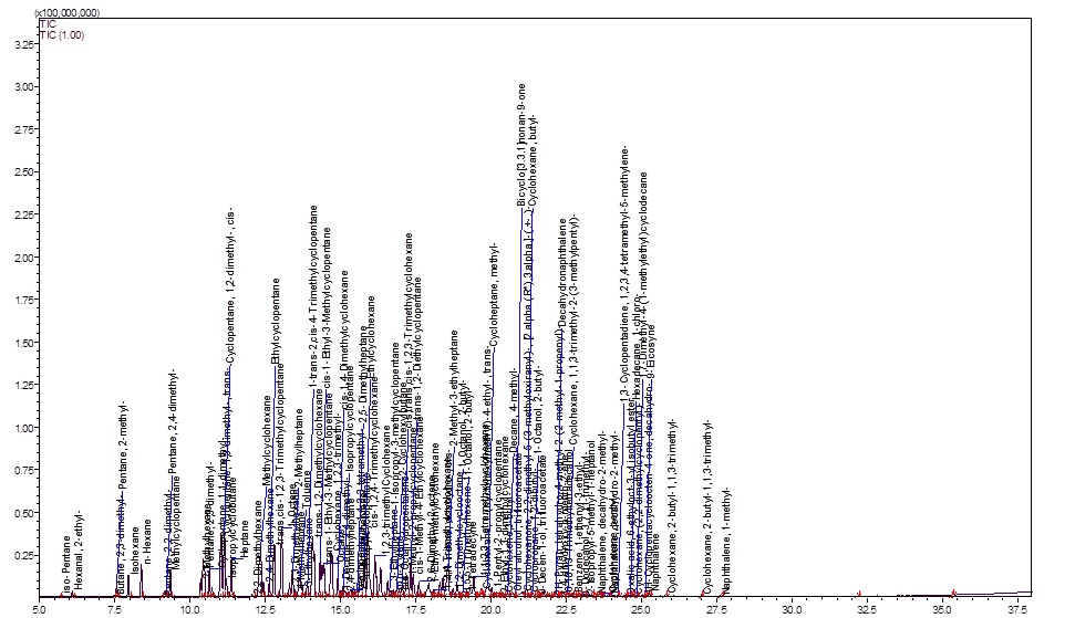 В газовоздушной смеси, образованной при испарении нефти, методом хромато-масс-спектрометрии провели определение химических соединений, входящих в её состав. В образце газовоздушной смеси идентифицировали 98 химических веществ (рис. 1).