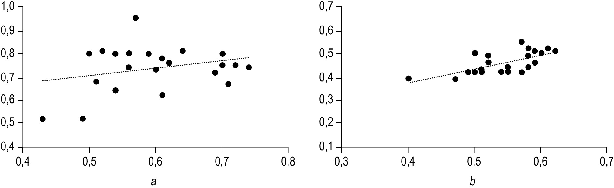 Рис. 1. Корреляции между интервалами РР при клиностатической пробе (a) и пробе Мартине (b): по горизонтали — длительность интервалов (с) в контроле, по вертикали — длительность интервалов (с) после функциональной пробы.