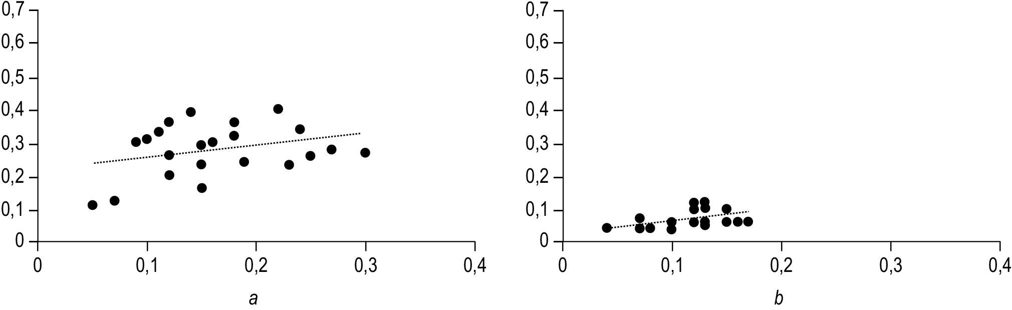 Рис. 2. Корреляции между сегментами ТР при клиностатической пробе (а) и пробе Мартине (b): по горизонтали — длительность интервалов (с) в контроле, по вертикали — длительность интервалов (с) после функциональной пробы.