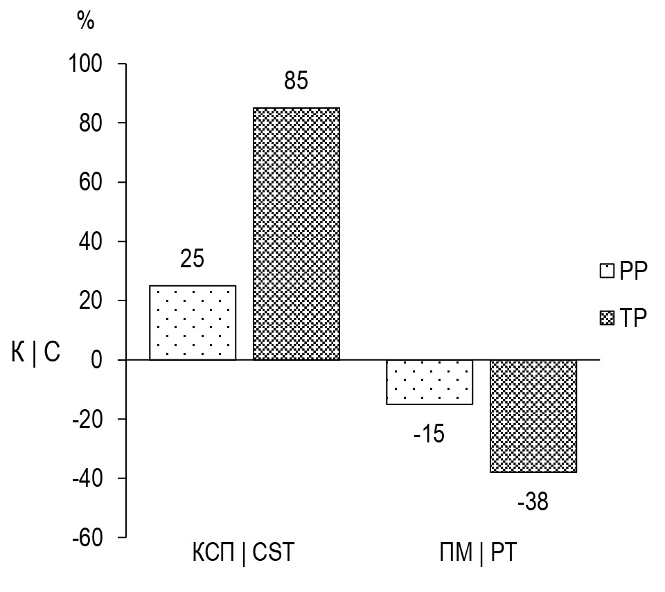 Fig. 3. Changes (in %) of PP intervals and TP segments compared to the control (С) in response to the clinostatic test (CSТ) and the Martinet test (PТ).