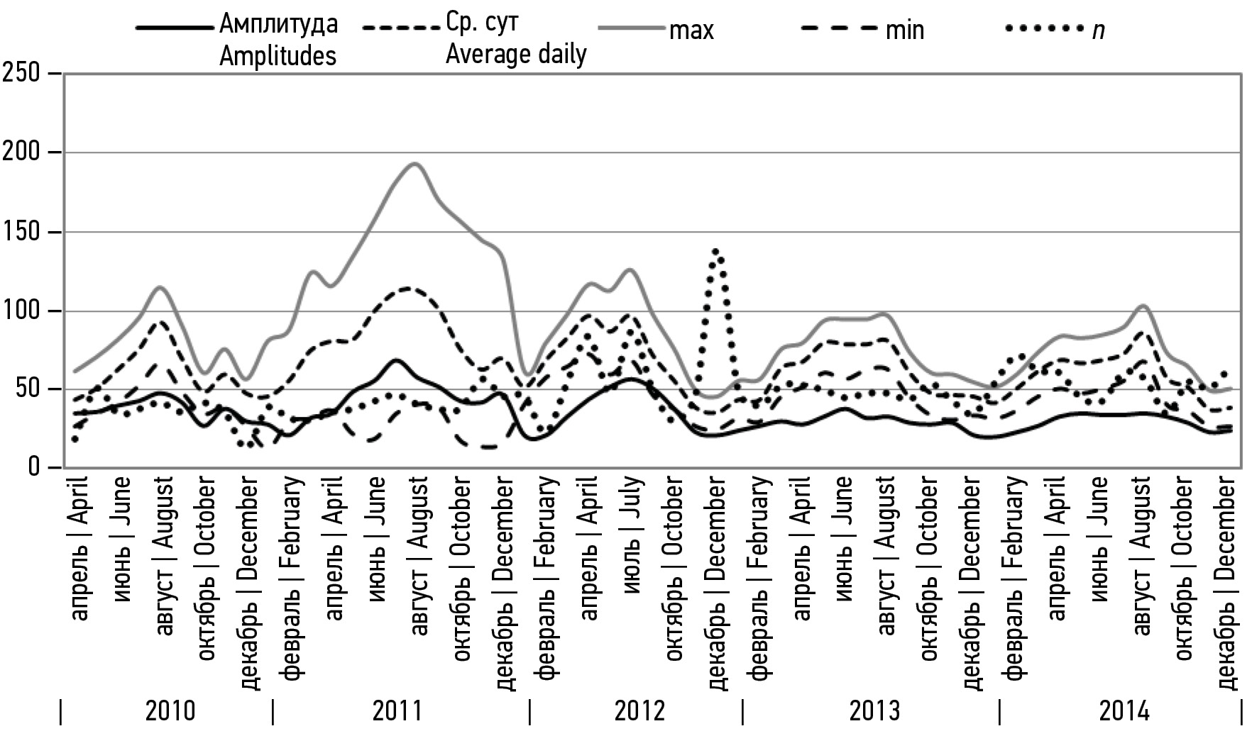 Таким образом, приведённое выше описание наблюдаемых изменений ежемесячных и сезонных вызовов скорой медицинской помощи и КПО, на первый взгляд, не позволяет говорить о каких-либо однозначных результатах. Однако корреляционный анализ ежесуточных данных по месяцам каждого года за весь период наблюдения выявил 5 статистически значимых ( р ≤0,05) и 9 на уровне тенденции ( p ≤0,10) корреляционных связей за период 2011–2013 гг. включительно, причём преимущественно в холодное время года. С амплитудой изменений, средними, максимальными и минимальными КПО за сутки выявлено 3, 3, 4 и 3 корреляции соответственно (табл. 2). При этом все статистически значимые зависимости зарегистрированы в 2012 г. В этом же году отмечалось наибольшее число корреляционных связей, а величины коэффициентов корреляции были выше, чем в другие годы. Визуальный анализ динамики параметров КПО с апреля 2010 по декабрь 2014 г. показал, что больше корреляционных связей отмечалось в 2012 г., а также в 2011 г., когда была высокая вариабельность КПО на фоне максимальных экстремумов и сравнительно высоких среднесуточных значений, хотя и имелись неожиданные эпизоды в виде резкого увеличения числа вызовов в конце декабря 2012 г. на фоне спокойной озоновой ситуации (см. рис. 2).