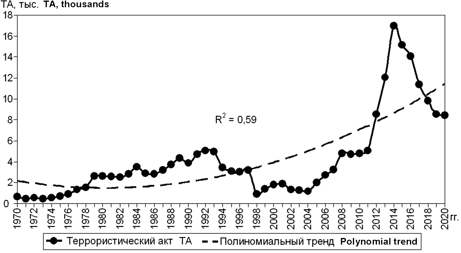 C 1970 по 2020 г. в мире учтены около 215 тыс. ТА. Среднегодовой показатель террористической активности — 4,2 тыс. (3,1 [1, 4; 4, 8] тыс.) ТА. Полиномиальный тренд числа ТА при высоком коэффициенте детерминации (R2=0,59) демонстрировал увеличение данных (рис. 1). Можно полагать, что определённый вклад в рост террористической активности с 2001 г. оказывал её более эффективный учёт, так как сведения до этого периода собирались, как правило, ретроспективно.