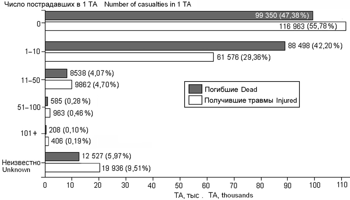 На рис. 2 показана структура ТА по тяжести медико-биологических последствий. Оказалось, что без жертв и травмированных было совершено 47,4 и 55,8% ТА. От 51 до 100 погибших оказалось в 585 (0,28%) ТА, 101 погибший и более — в 208 (0,10%) ТА, получивших травмы — в 963 (0,46%) и 406 (0,19%) ТА соответственно.