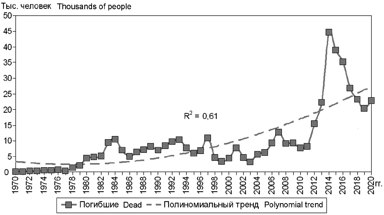 C 1970 по 2020 г. в ТА погибли 489,5 тыс. человек, среднегодовой показатель — 9,6 тыс. (7,1 [4, 4; 10, 3] тыс.) человек. Среди всех погибших террористов оказалось более 80 тыс. (16,5%). Полиномиальный тренд числа погибших в ТА при высоком коэффициенте детерминации (R2=0,61) демонстрировал увеличение данных (рис. 3).