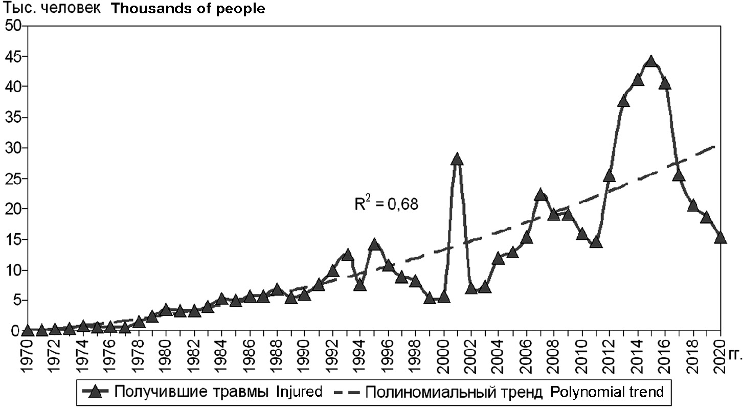 C 1970 по 2020 г. в ТА получили травмы 597,8 тыс. человек, среднегодовой показатель — 11,7 тыс. (7,6 [3, 6; 15, 9] тыс.) человек. Травмированных террористов было 19,1 тыс., или около 3,3% от всех людей, получивших травмы. Полиномиальный тренд при высоком коэффициенте детерминации (R2=0,68) представлял увеличение данных (рис. 4). Отмечается высокая вероятность погибнуть при ТА, например, соотношение погибших и поражённых (травмированных) среди населения было 1,0 : 1,4, среди террористов — 4,2 : 1,0.