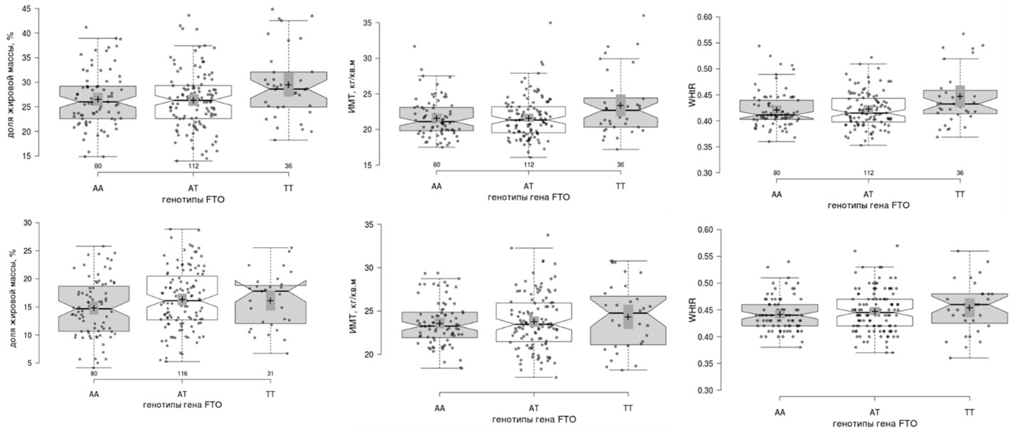 Fig. 1. Distribution of body fat percentage, body mass index (BMI), and waist-to-height ratio (WHtR) across FTO genotypes in subgroups of women (top row) and men (bottom row). Numbers above the abscissa are sample sizes. Crosses are mean values, box waists are medians, gray rectangles are 95% CI for means, and notch widths are 95% CI for medians. “Доля жировой массы, %” — percent of body fat, %; “индекс массы тела, кг/кв.м” — BMI, kg/m2; “генотипы гена FTO” — FTO genotypes.