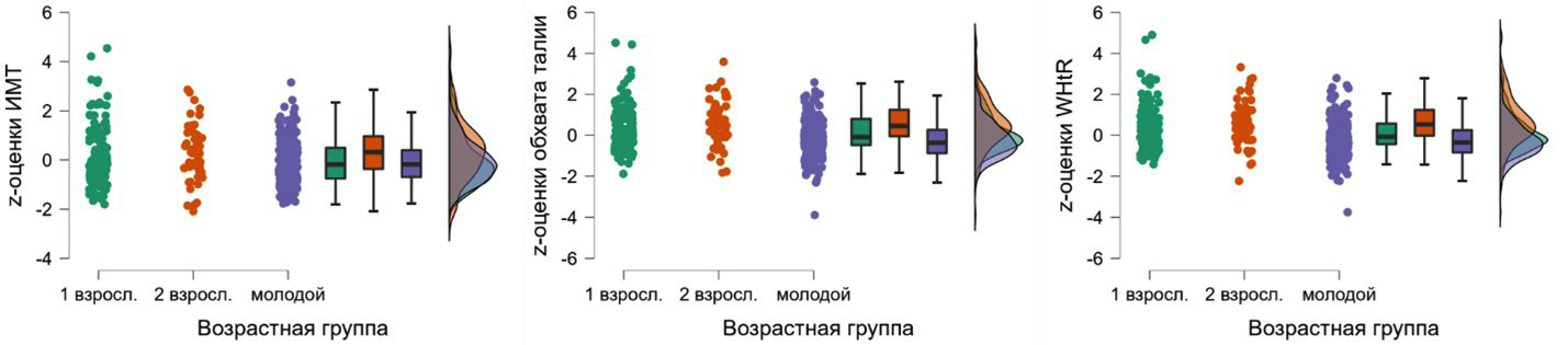 Fig. 2. Standardized estimates (z-scores) of anthropometric characteristics reflecting nutritional status and severity of abdominal fat deposition in age subgroups of the combined sample: BMI — body mass index; WHtR — waist-to-height ratio; z-оценки ИМТ — BMI z-scores; z-оценки охвата талии — waist circumference z-scores; z-оценки WHtR — WHtR z-scores; 1 взрослый — adult 1, 2 взрослый — adult 2, молодой — young; Возрастная группа — age group.