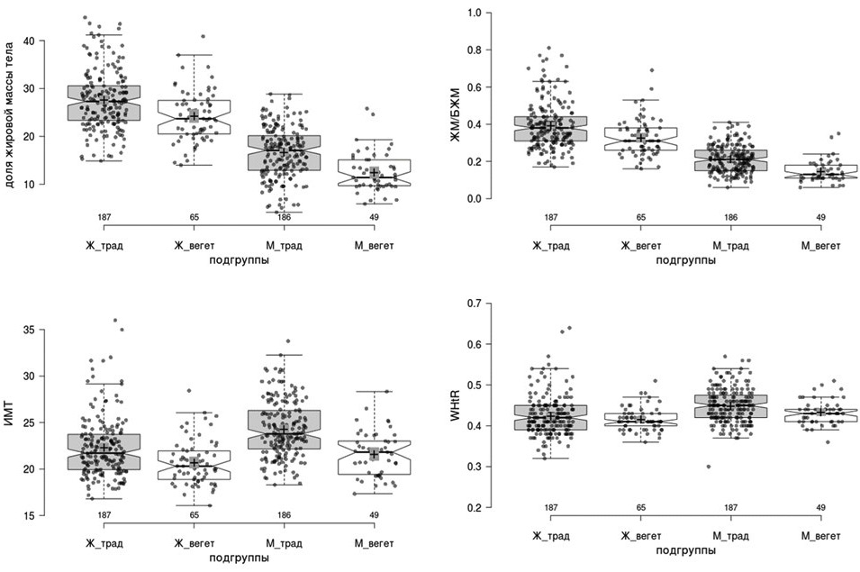 Рис. 3. Значения доли жировой массы, индекса массы тела (ИМТ), отношения жировой к безжировой массе тела (ЖМ/БЖМ) и отношения обхвата талии к длине тела (WHtR) в подгруппах мужчин (М) и женщин (Ж), придерживающихся традиционной (трад.) и вегетарианской (вегет.) диеты. Числа над осью абсцисс — объёмы выборок, кресты — средние значения, перетяжки коробов — медианы, серые прямоугольники — 95% ДИ для средних, ширина вырезов — 95% ДИ для медиан.
