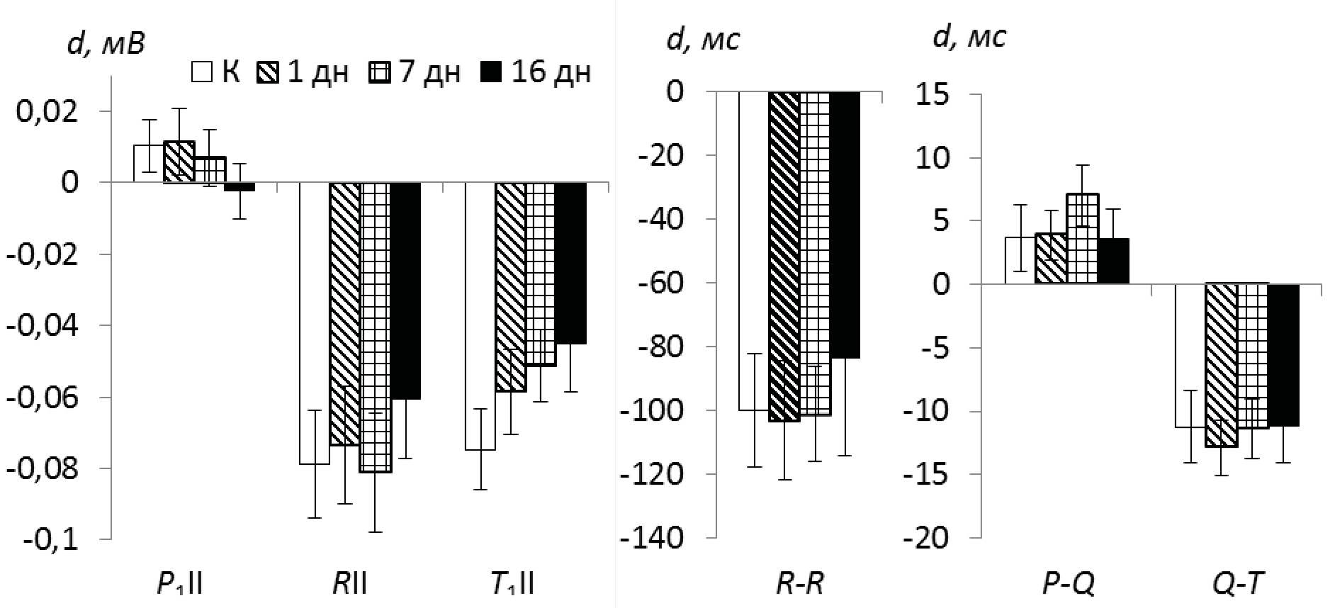 В состоянии покоя обнаружено отсутствие статистически значимых отличий (р >0,05) в изменениях амплитудных параметров ЭКГ после ИНГ тренировок, когда в среднем они, по сравнению с контролем, колеблются в следующих пределах: для P1I — от 0,128±0,008 до 0,110±0,009 мВ, для RII — от 1,428±0,073 до 1,409±0,064 мВ, для T1II — от 0,357±0,019 до 0,391±0,023 мВ. При этом в покое только в отдельные периоды после ИНГ тренировок статистически значимо изменялись кардиоинтервалы. Так, относительно контроля в 1-й день после ИНГ тренировок увеличивалась длительность интервала R-R с 862,1±31,5 до 943,8±26,4 мс (р=0,029) и Q-T — с 376,2±5,5 до 392,8±4,1 мс (р=0,005), на 7-й день уменьшался P-Q с 160,7±4,9 до 151,7±3,6 мс (р=0,016), а на 16-й день увеличивался Q-T до 396,4± 82 мс (р=0,043).
