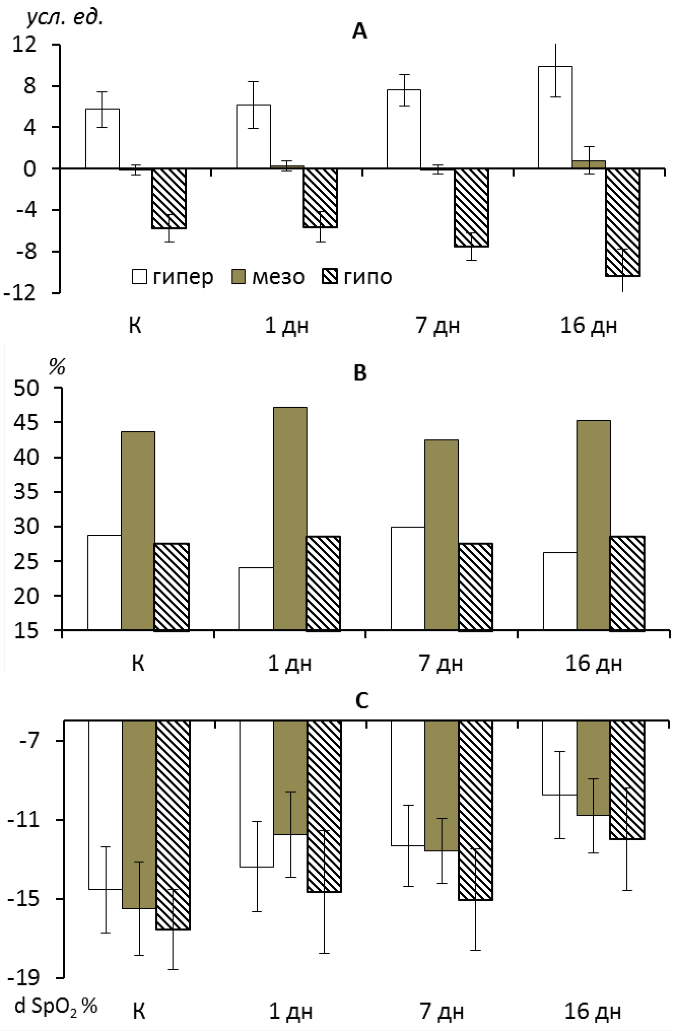 Рис. 2. Интегральные значения хроноинотропных типов реакции (гиперреактивный — гипер, мезореактивный — мезо, гипореактивный — гипо) сердца (А), количественные их значения (В) и отклонения оксигенации крови (С) при острой гипоксии в контроле (К) и в разные периоды (1-й, 7-й и 16-й дни) после интервальных гипоксических тренировок (М±tmd).