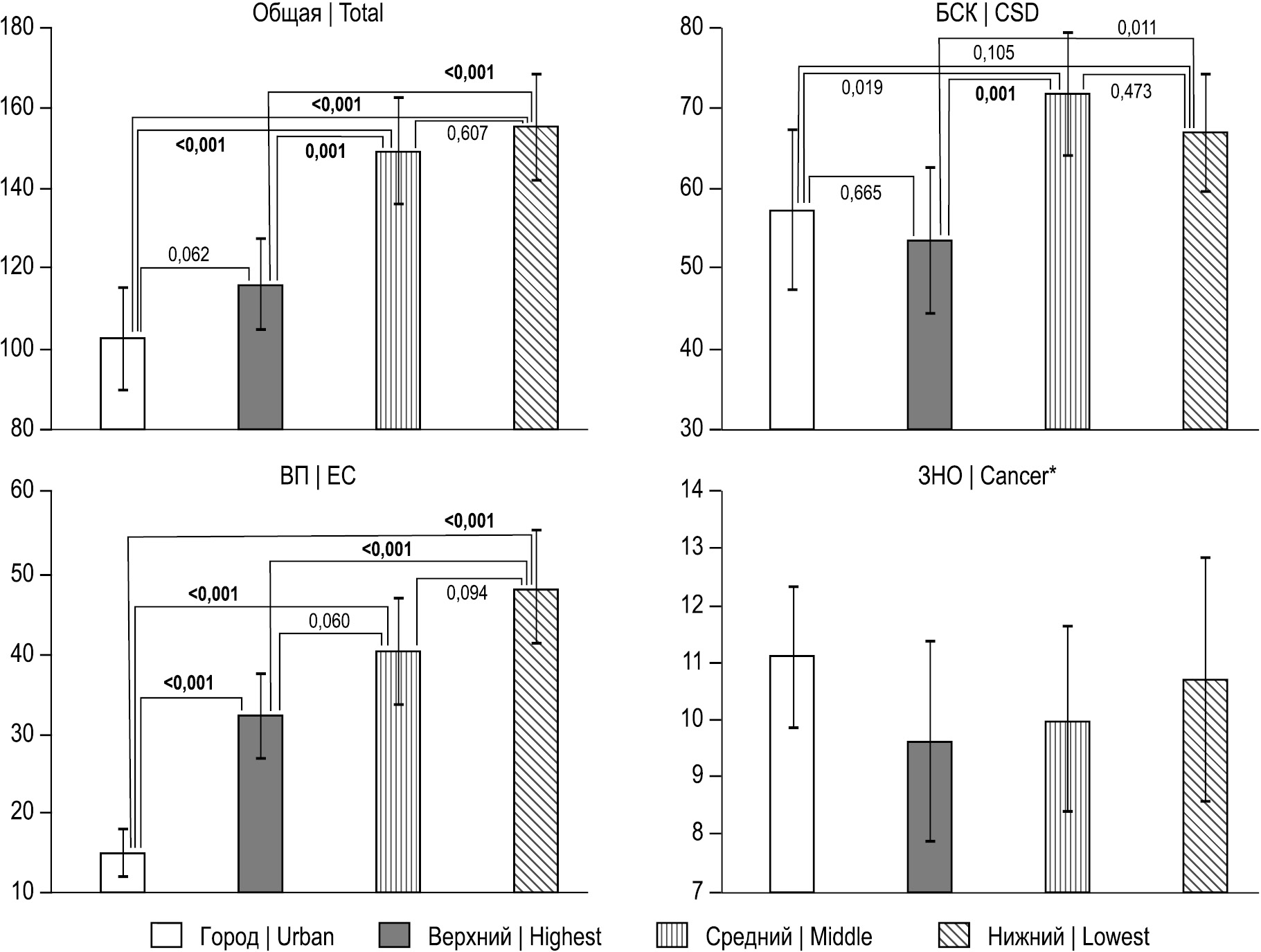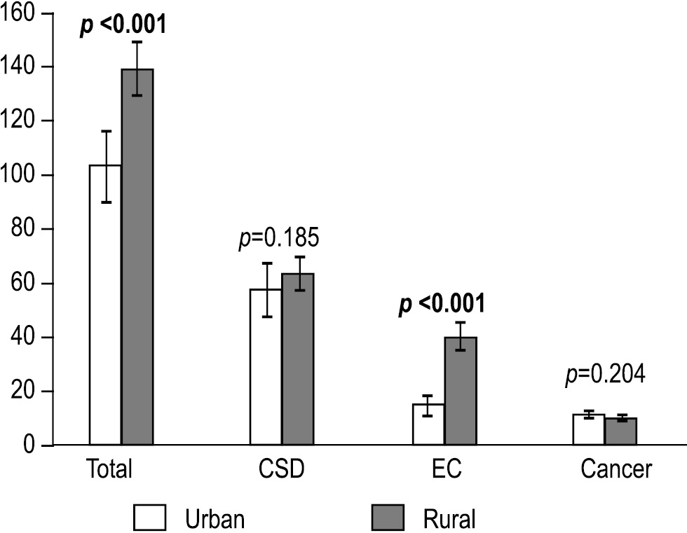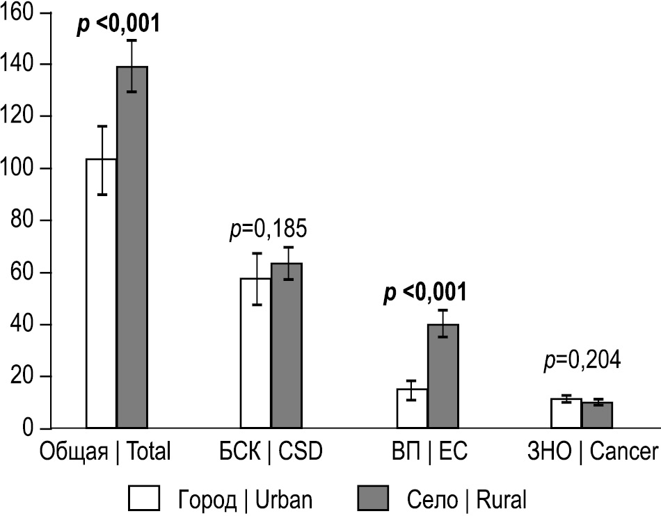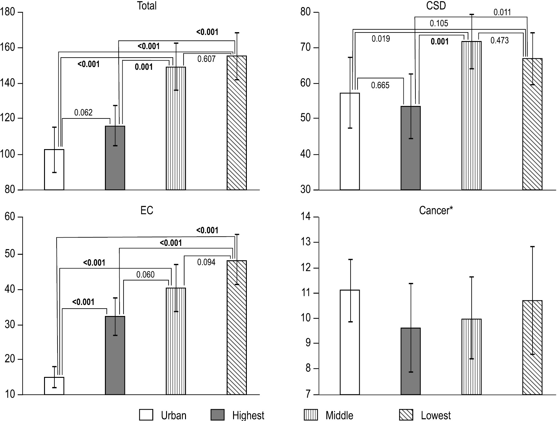 3. Fig. 2. Average annual (2000–2019) age-standardized rates of total mortality, mortality from circulatory system diseases (CSD), external causes (EC) and cancer, per 10 thousand of the urban population compared to rural Nenets Autonomous Okrug population divided into tertiles (highest, middle and lowest), with the designation of 95% CI and p-values for the compared mortality rates in the populations; * differences between the compared populations are statistically insignificant, since the Kruskal–Wallis test level exceeds 0.05.