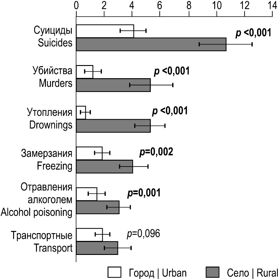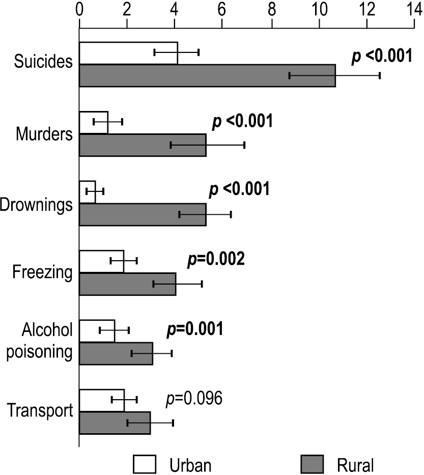 Excess of the average annual rates of separate external causes of mortality of the rural population over the corresponding mortality levels of the urban population of Nenets Autonomous Okrug amounted to 2.6 times for suicides, 4.4 times for drownings, 7.6 times for freezes, 2.2 times for murders, 2.1 times for alcohol poisoning, and 1.6 times for transport accidents. All rural rates were significantly higher than urban ones, except for transport accidents.