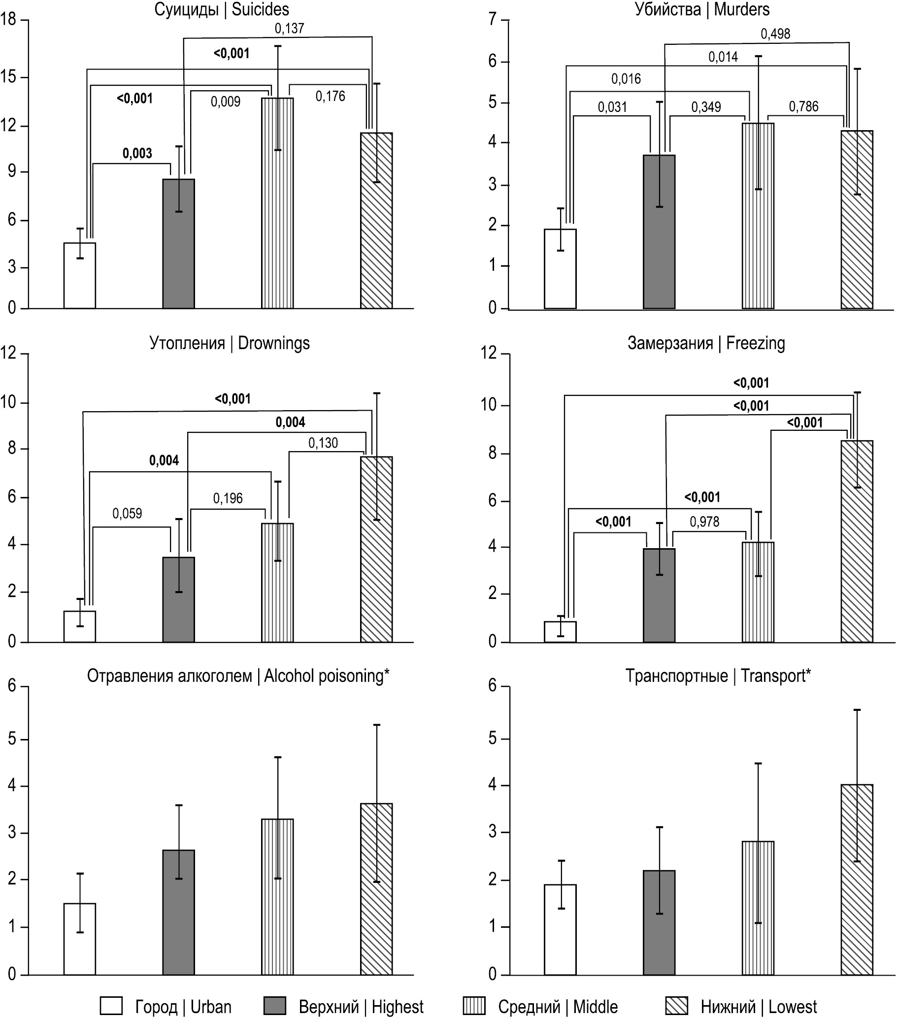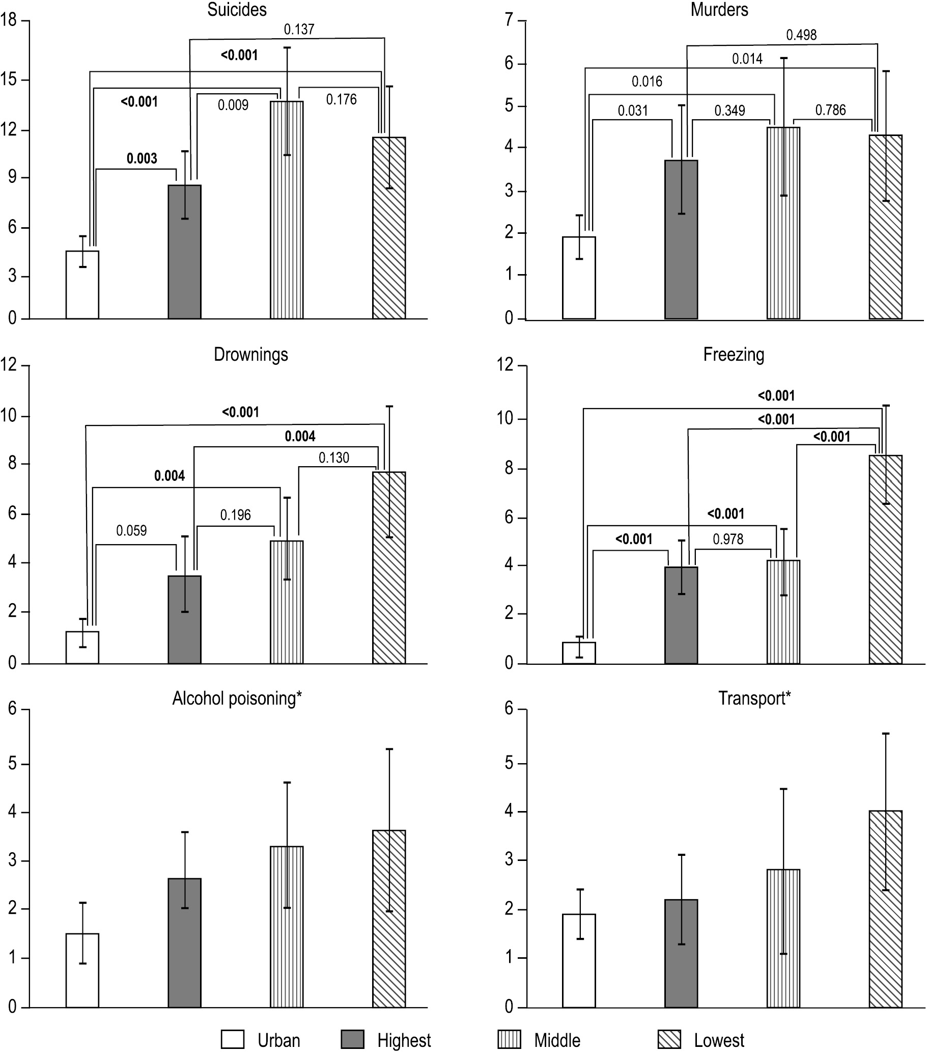 Fig. 4. Average annual (2000–2019) age-standardized rates of mortality from external causes, per 10 thousand of the urban population compared to the rural Nenets Autonomous Okrug population divided into tertiles (highest, middle and lowest), with the designation of 95% CI and p-values for the compared mortality rates in the populations; * differences between the compared populations are statistically insignificant, since the Kruskal–Wallis test level exceeds 0.05.