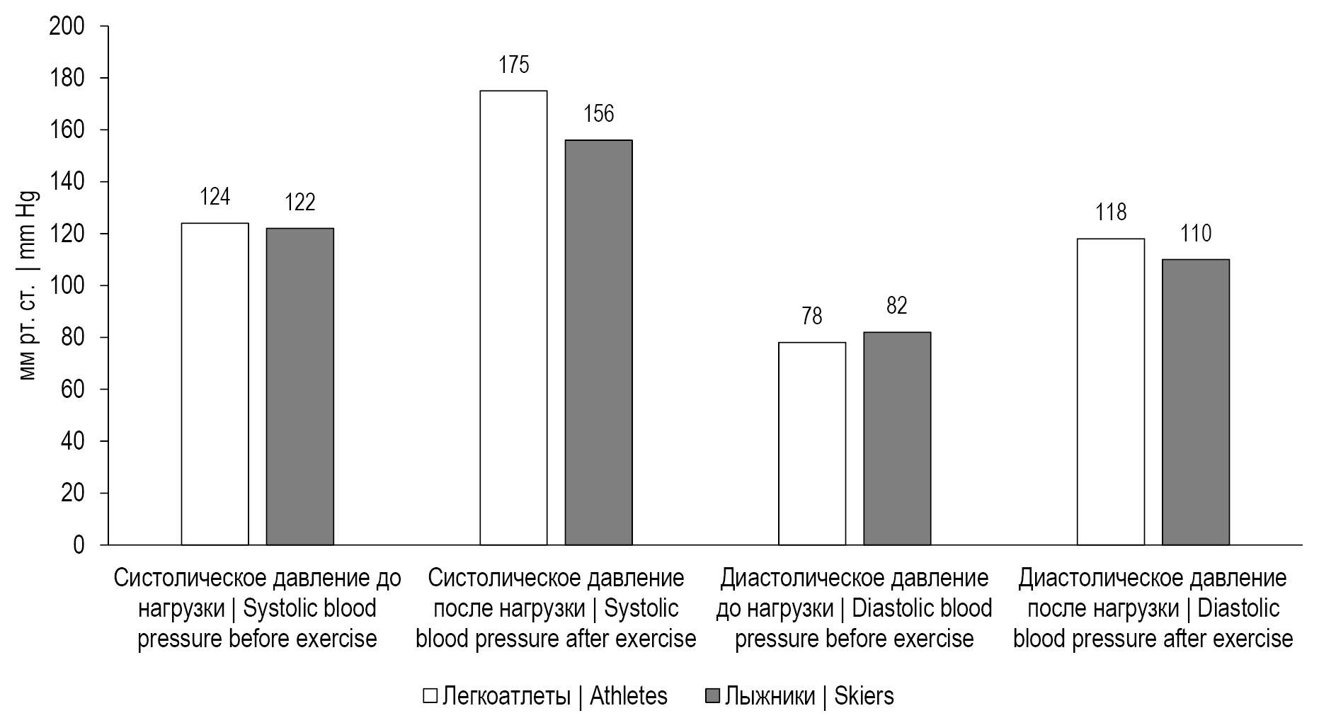 Рис. 1. Уровень артериального давления у легкоатлетов и лыжников до и после тренировочной нагрузки.