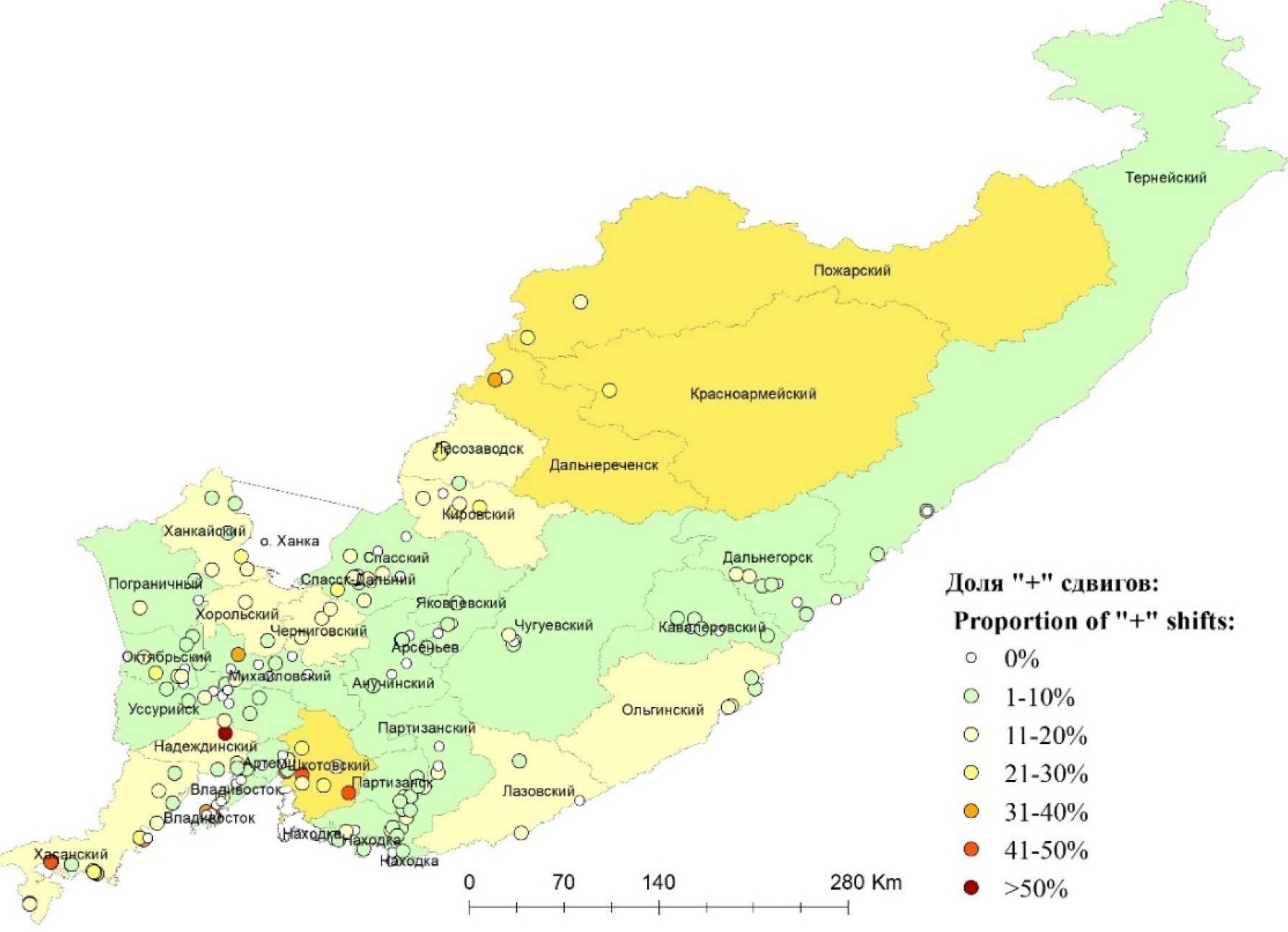 Выявлены и наглядно визуализированы территории Приморского края по относительным показателям (доля в % ± ошибка репрезентативности) негативной динамики. Для пространственного анализа использовали геоинформационную систему ESRI ArcGIS версия 10.8. Созданы векторные карты муниципальных образований, в границы которых нанесены мониторинговые точки по их географическим координатам.