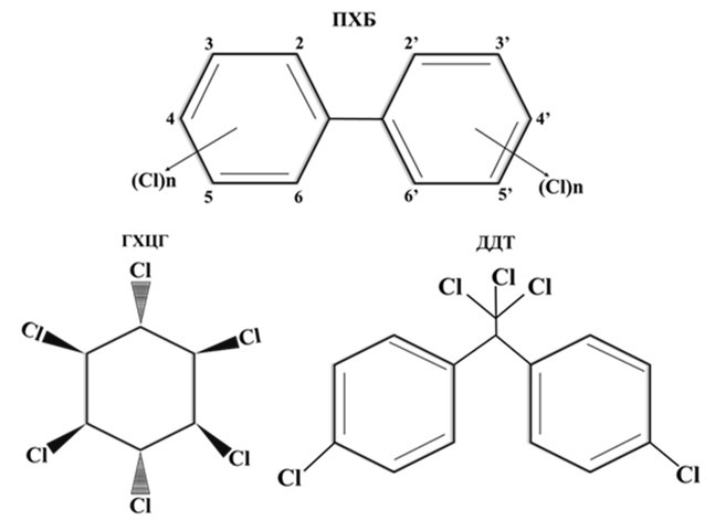 Fig. 1. Molecular structure hexachlorocyclohexane (ГХЦГ), dichlorodiphenyltrichlordoethane (ДДТ) and polychlorinated biphenyls (ПХБ).