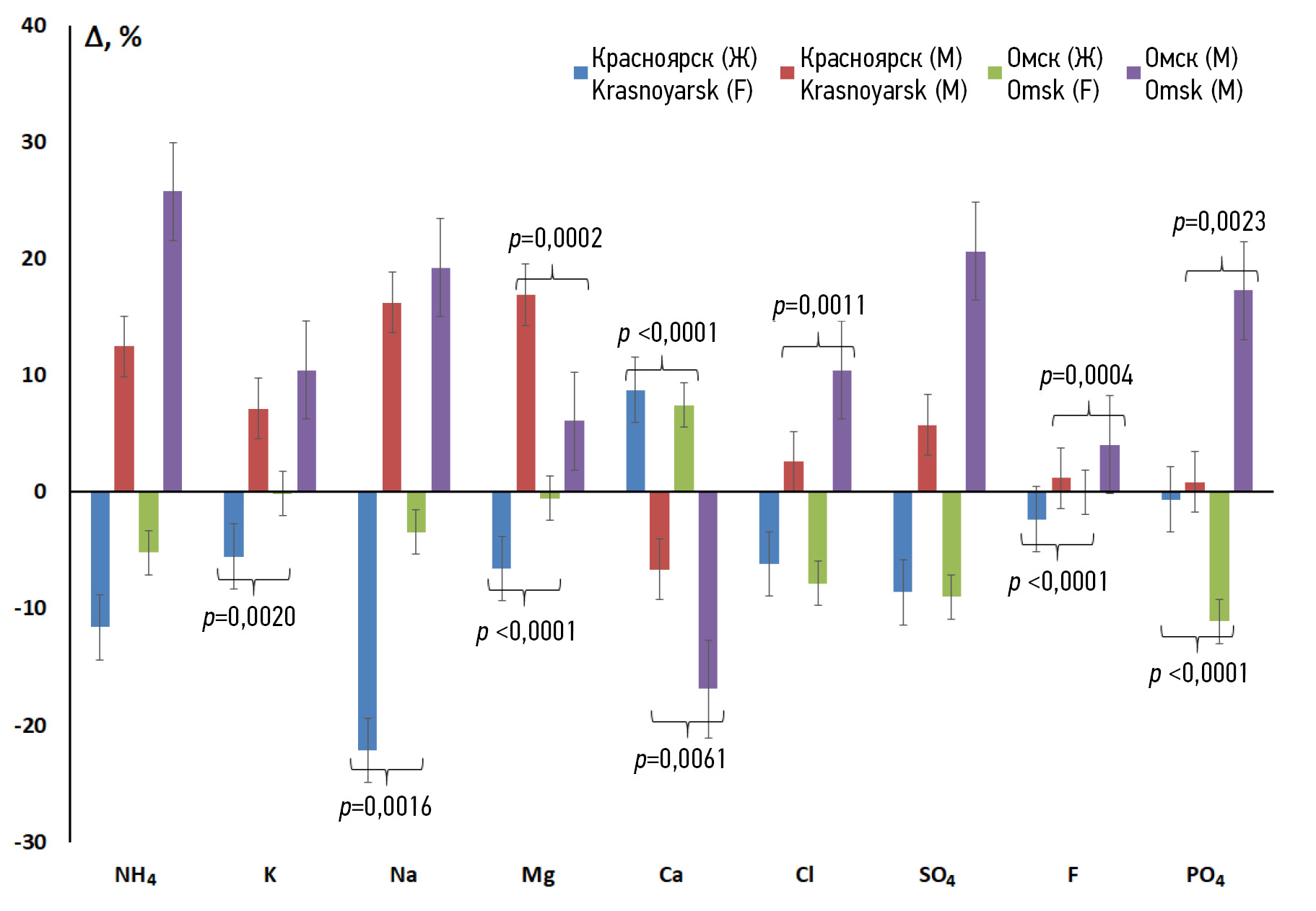 Рис. 1. Относительное изменение концентрации катионов и анионов в слюне в зависимости от пола для жителей Омска и Красноярска (%). Относительное изменение рассчитано как соответствующее значение для мужчин (М) и женщин (Ж) в каждом городе минус среднее значение для данного города, делённое на среднее значение (%). Различия между параметрами у добровольцев одного пола между городами статистически достоверны, р <0,05.