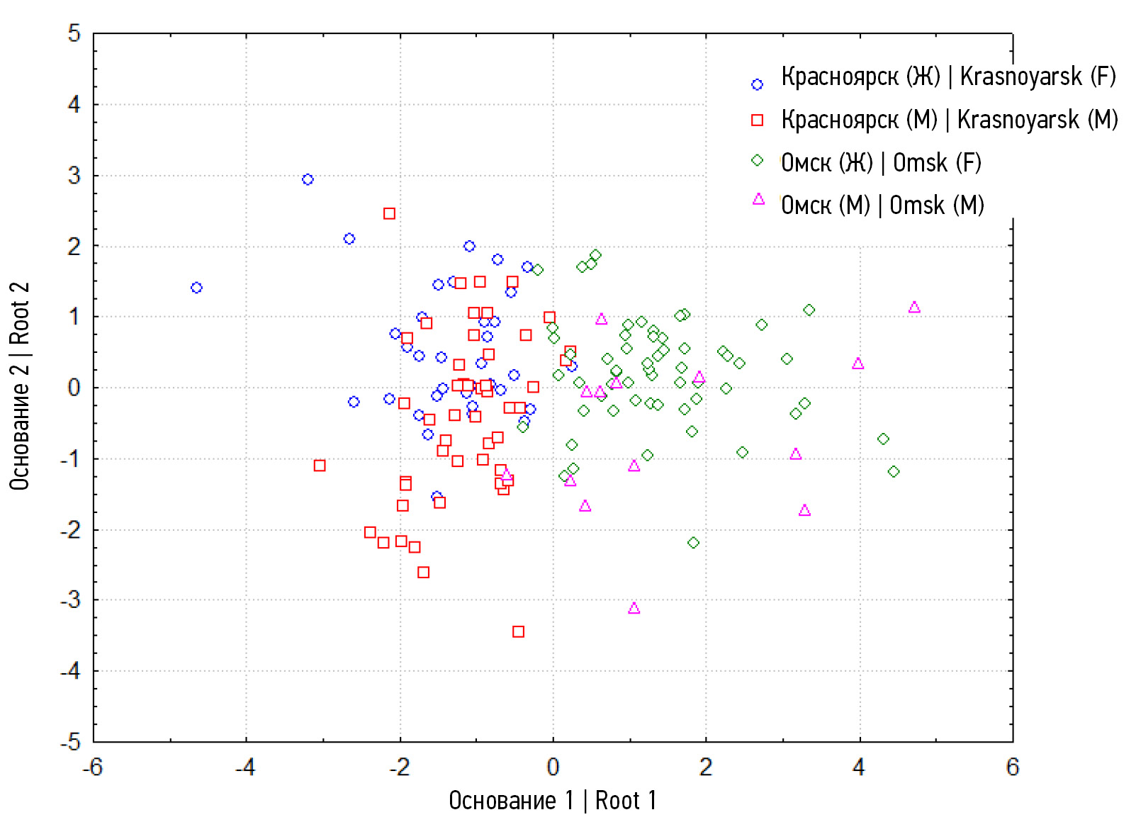 Для оценки возможности разделения исследуемых групп проводили дискриминантный анализ с помощью программы Statistica 10.0 (StatSoft). Дискриминантный анализ позволяет изучать различия между двумя и более группами объектов по нескольким переменным одновременно. Основной целью дискриминации является нахождение такой линейной комбинации переменных, которая бы оптимально разделила рассматриваемые группы. Такая комбинация называется функцией дискриминации (канонической функцией). Для четырёх сравниваемых групп (Омск — женщины и мужчины, Красноярск — женщины и мужчины) необходимо построение трёх функций дискриминации. Наибольшей разделительной способностью обладает первая дискриминантная функция, поэтому на диаграмме рассеяния канонических значений по горизонтальной оси показан результат дискриминации с использованием первой функции (основание 1), по вертикальной оси — с использованием второй функции (основание 2). Качество дискриминации оценивается по смещению соответствующих точек относительно вертикальной и горизонтальной осей «0–0».