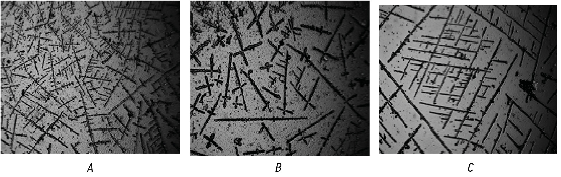 Рис. 3. Примеры основных типов микрокристаллизации слюны жителей Омска и Красноярска: А — 2 балла, B — 3 балла, C — 4 балла.