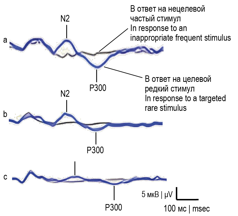 Рис. 1. Пример слуховых потенциалов, связанных с событиями Р300, зарегистрированных в лобной области мозга (ответы, полученные в результате усреднения): а — испытуемый А. из контрольной группы (латентное время (ЛВ) N2=224 мс, ЛВ Р300=350 мс, амплитуда — 10,5 мкВ); b — испытуемый Л. из группы с артериальной гипертензией, получающий антигипертензивную терапию, контролирующий АД в пределах нормальных значений (ЛВ N2=230 мс, ЛВ Р300=352 мс, амплитуда — 9 мкВ); c — испытуемый М. из группы с артериальной гипертензией, не получающий антигипертензивную терапию, а также получающий её регулярно и нерегулярно и не контролирующий АД (ЛВ N2=250 мс, ЛВ Р300=390 мс, амплитуда — 5,5 мкВ).
