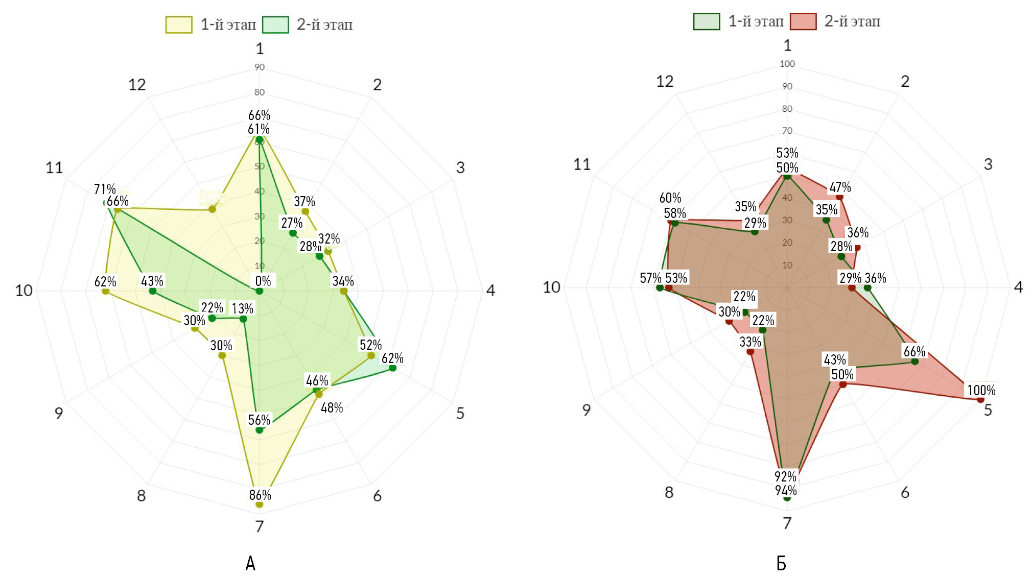 Рис. 1. Динамика паттернов матриц снижения функциональных резервов в опытной (А) и контрольной (Б) группах в ходе исследования; размерность осей от 0 до 100%. Условные обозначения см. в примечании к табл. 3.