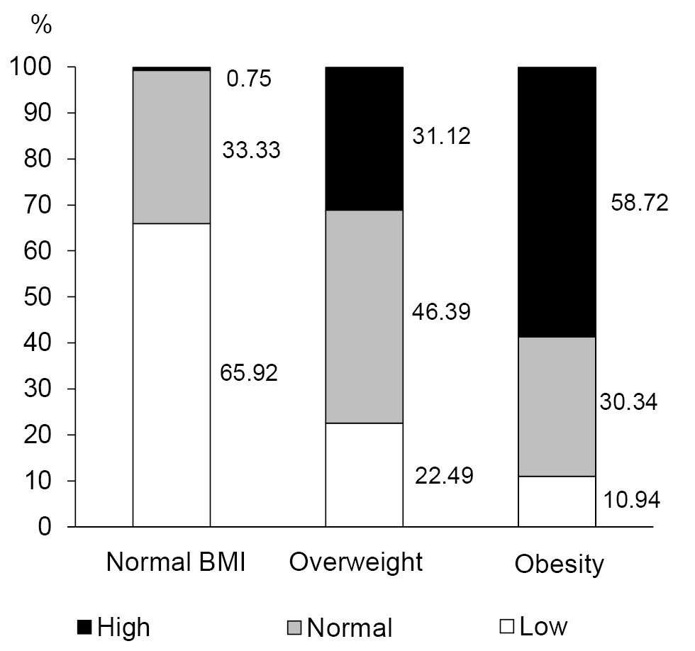 It is significant that 0.75% individuals with normal BMI have a high body fat percentage; whereas 30.34% obese individuals have a normal body fat percentage, and 10.94% obese individuals have a low body fat percentage.