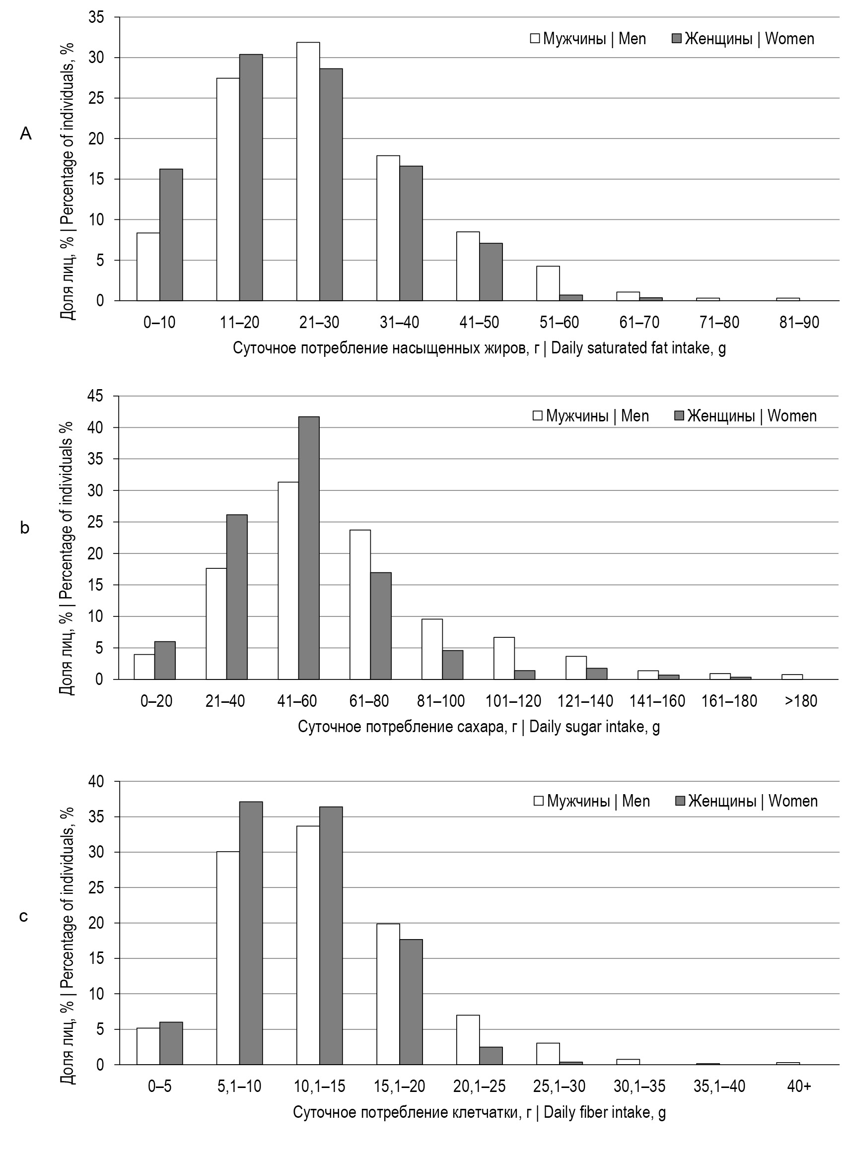 Установлено, что в суточном рационе мужчин, по сравнению с женщинами, статистически значимо превалирует потребление насыщенных жиров в группе рабочих, сахара и клетчатки — в группе служащих. При этом у мужчин свободный сахар в суточном рационе преобладает в группе служащих по сравнению с группой рабочих.