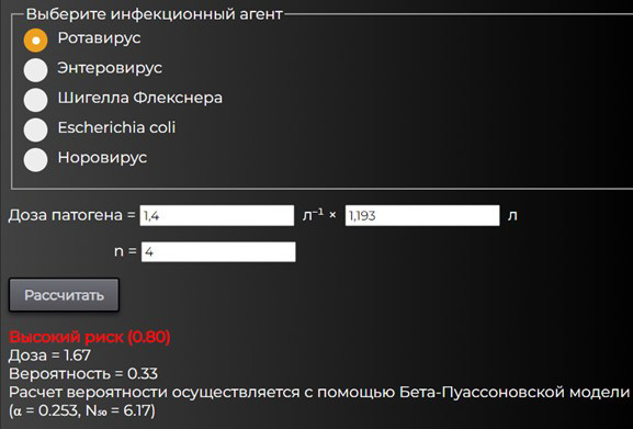 Рис. 3. Пример расчёта дозы, вероятности возникновения и коэффициента риска с помощью онлайн-калькулятора «Количественная оценка микробного риска».