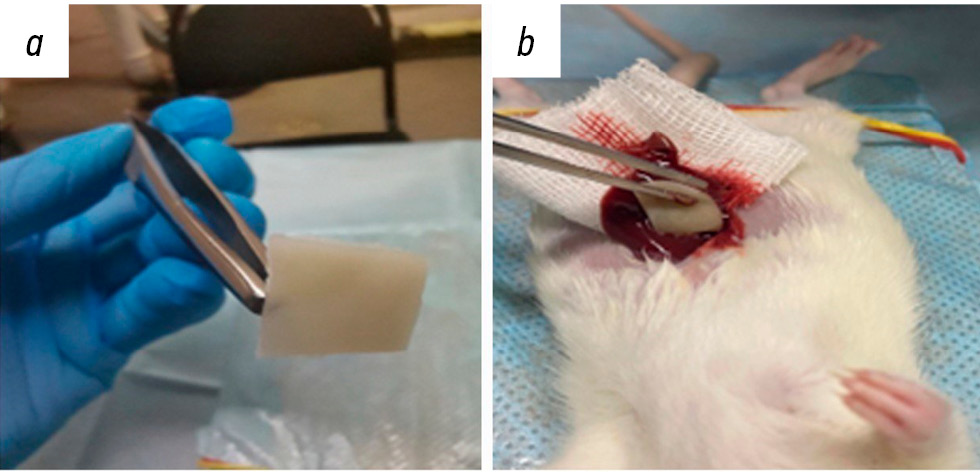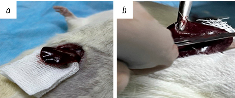 Рис. 2. Ксеногенный биоматериал на основе коллагена, полученного из шкуры северного оленя (a), и аппликация его на скальпированную рану печени (b).