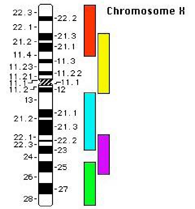 Рис. 1. Схема гибридизации зондов для Х-хромосомы: спектры возбуждения флуорохромов сопоставимы с аквамариновым, зелёным, оранжевым, красным и ближним инфракрасным спектром (XCyte 1. Human mBAND Probe. https://metasystems-probes.com/en/probes/mband/d-0201-030-di).
