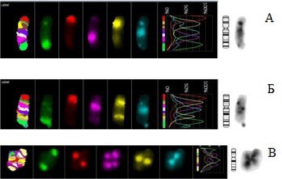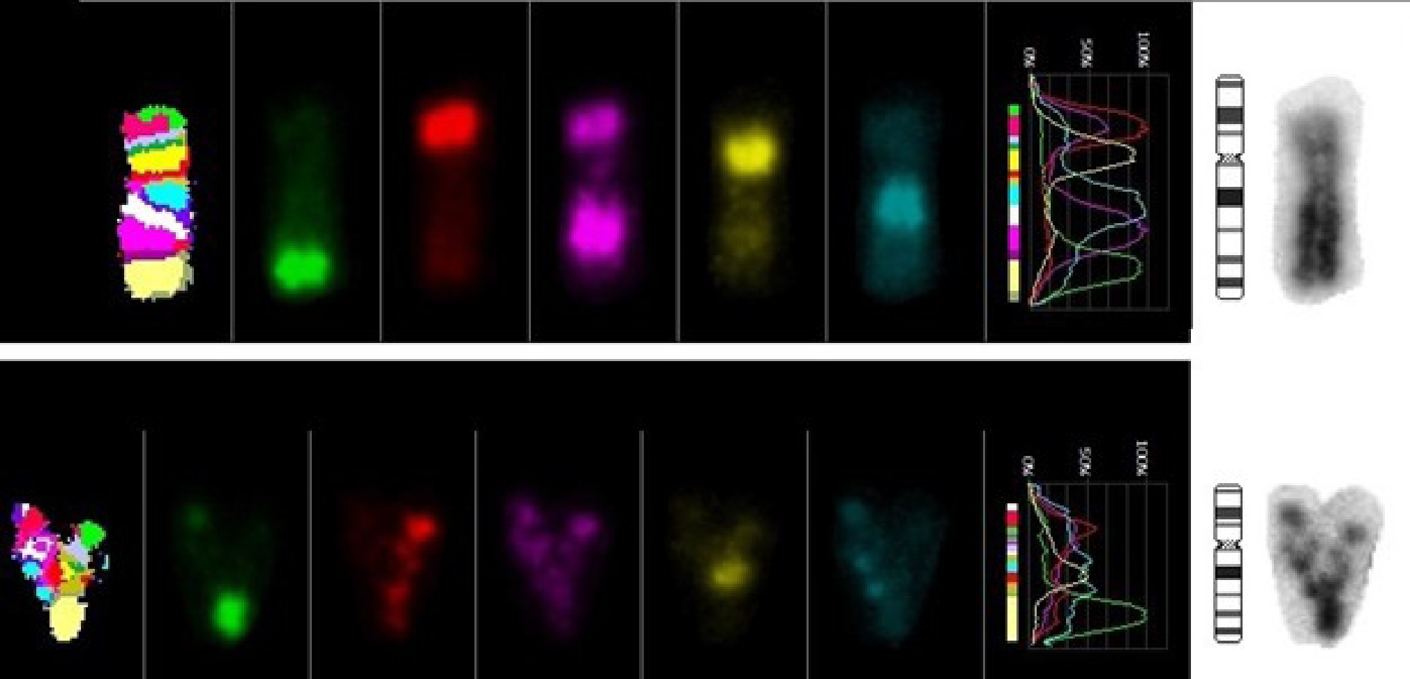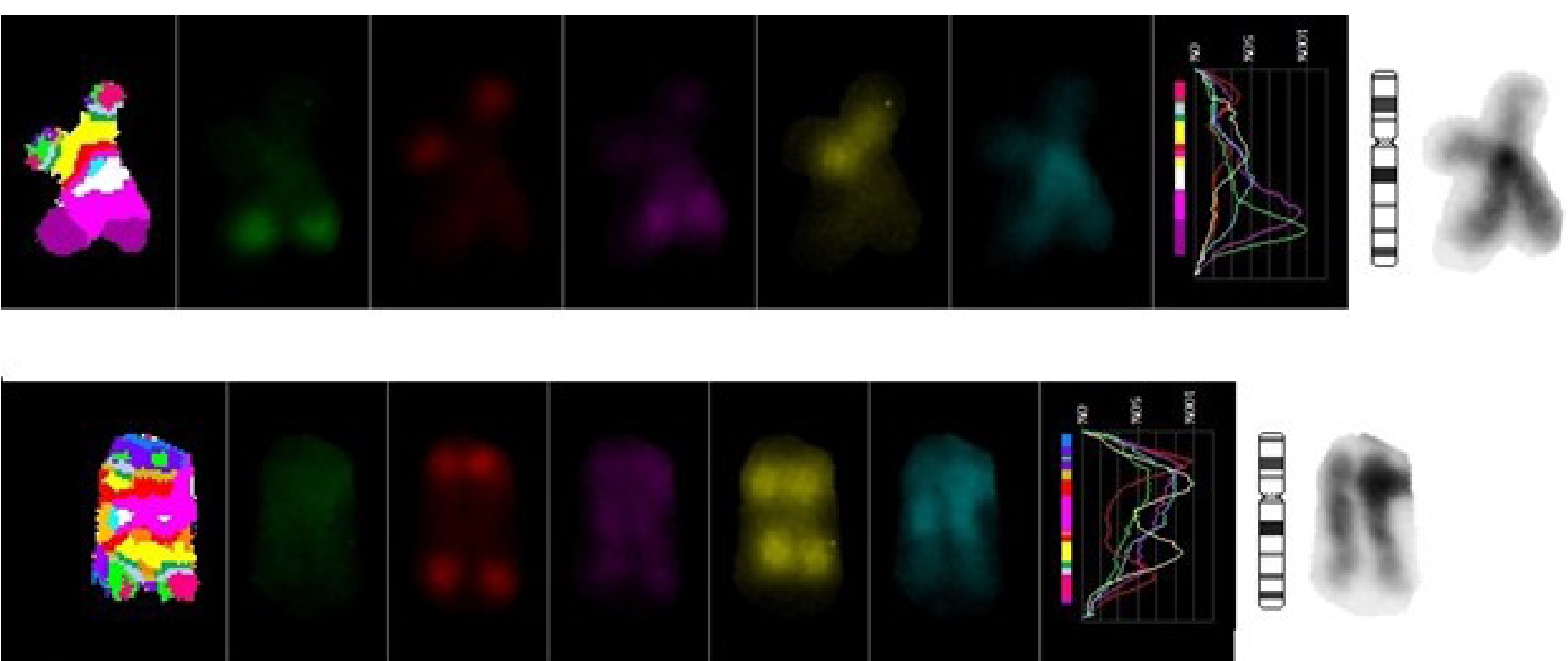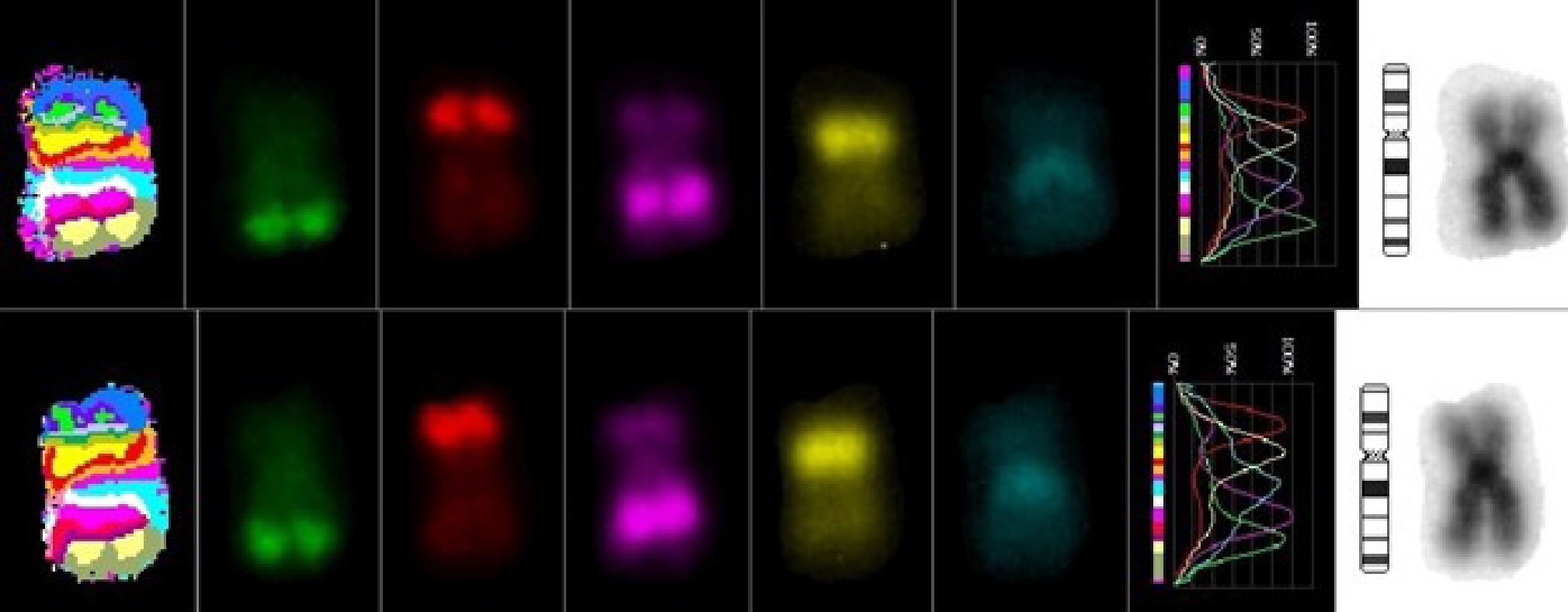 Работа с оцифрованными изображениями проводилась с помощью программного обеспечения Isis (Metasystems, Германия). Для исследования выбирали метафазы, содержащие Х-хромосомы без артефактов. Анализировали Х-хромосомы в соответствии с расположением спектров возбуждения флюорохромов, как показано на рис. 1. На рис. 2 представлены Х-хромосомы, окрашенные методом mBAND (без аберраций).