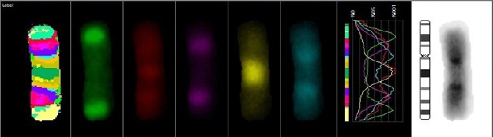 Метод mBAND (multicolor banding) основан на гибридизации частей хромосомы зондами, меченых различными флуорохромами, вдоль длины хромосомы, таким образом, что зонды гибридизуются частично перекрываясь на отдельных участках хромосом. Характерная многоцветная полосчатая картина mBAND создаётся путём количественной оценки соотношения интенсивности флуоресценции вдоль хромосомы. Эти соотношения уникальны и визуализируются в виде псевдоцветов, специфичных для каждой полосы (рис. 1). mBAND предоставляет информацию, которая позволяет проводить точный анализ даже очень сложных меж- и внутрихромосомных аберраций1.