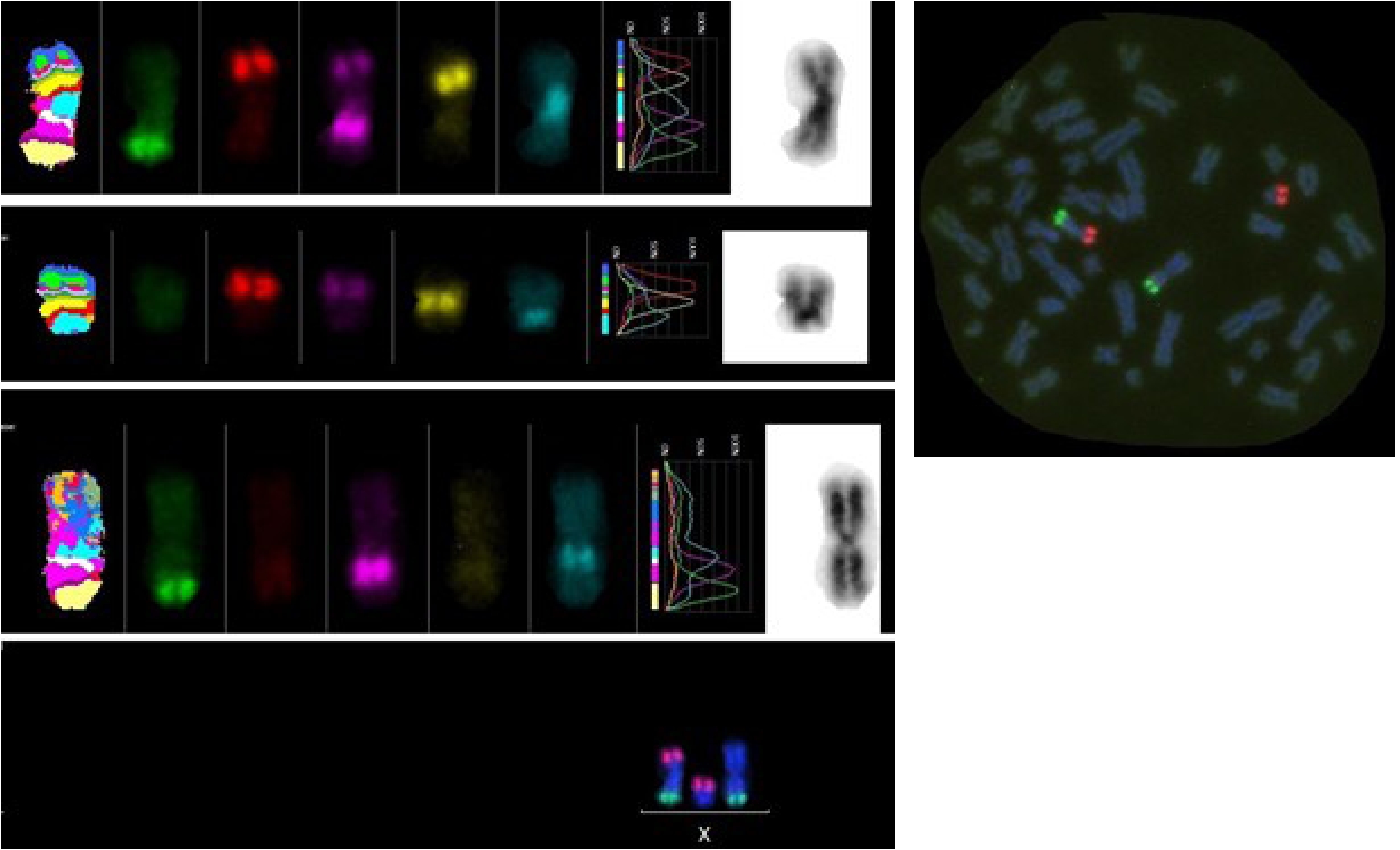 Рис. 5. Транслокация с участием Х-хромосомы (слева — вид метафазной пластинки; справа — расположение спектров возбуждения флюорохромов).
