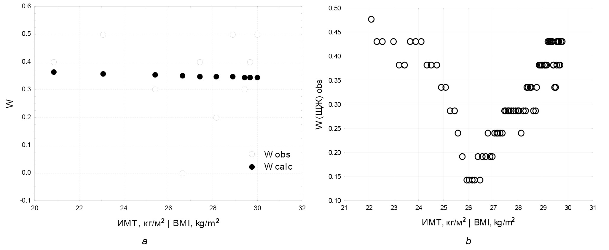 9. Fig. 8. Thyroid disease: a. probabilities W from data obtained by stratifying 100 patients into 10 strata (open circles) as a function of body mass index (BMI), full circles represent results of logistic regression calculations (calc), b. probabilities Wobs for moving average data as a function of BMI (moving average window is 21 patients, total 80 strata).