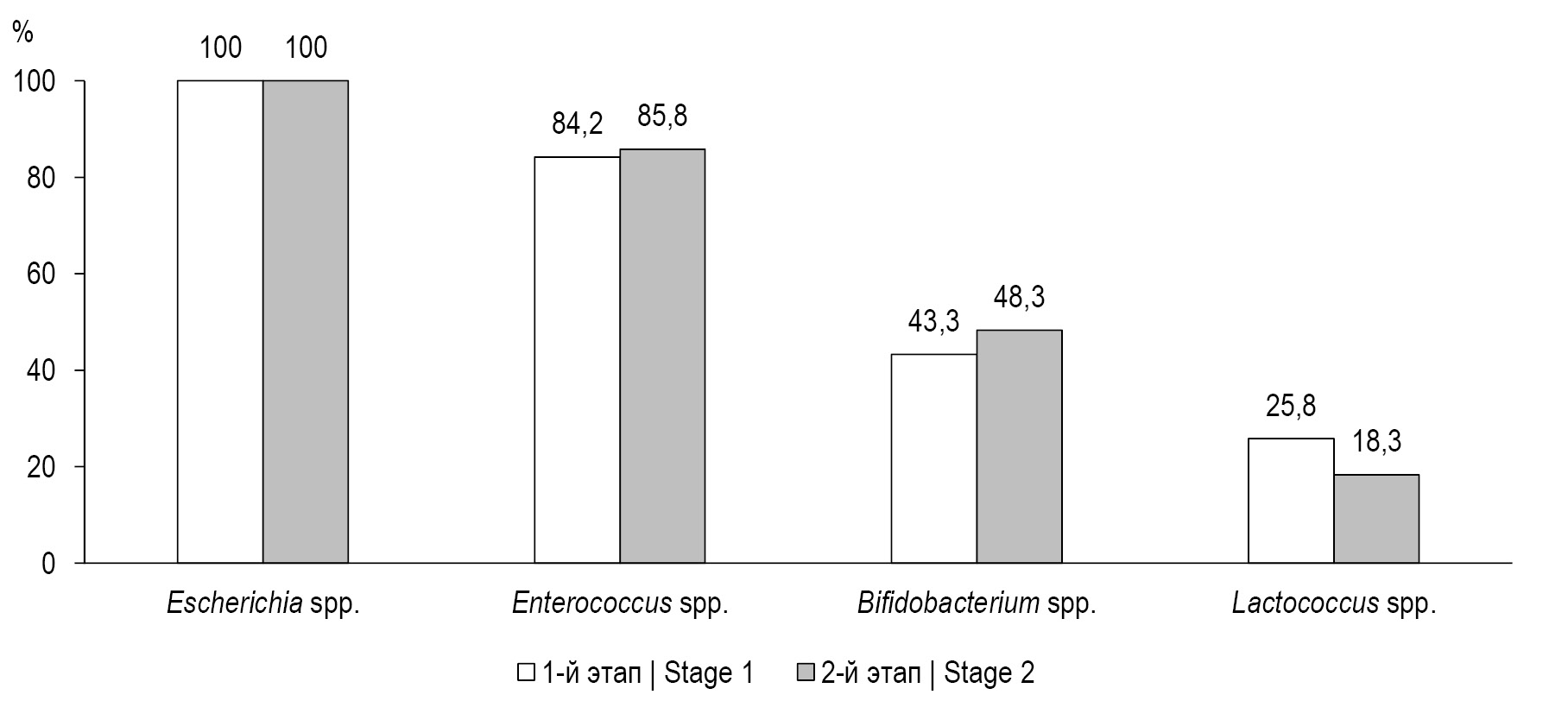 Проанализировали облигатную микробиоту кишечника обследуемых лиц (рис. 1). Анализ облигатной микробиоты кишечника представлен двумя этапами: до формирования организованного коллектива (1-й этап исследования) и после формирования (2-й этап исследования). Escherichia spp., включая штамм Escherichia coli, является неотъемлемым компонентом кишечной микробиоты, он выявлен в 100% случаев на всех этапах исследования. Бактерии рода Enterococcus составили значительную часть представителей облигатной микрофлоры и были обнаружены в 86,6% случаев на 2-м этапе исследования. Наиболее значимый представитель облигатной микрофлоры Bifidobacterium spp. составил 48,3% на 2-м этапе исследования в сравнении с 1-м этапом (43,3%). Бактерии рода Lactococcus были обнаружены в 18,3% случаях на 2-м этапе исследования. Стоит отметить их уменьшение в сравнении с 1-м этапом исследования (25,8%). Представитель облигатной микрофлоры Peptostreptococcus spp. не был выявлен в ходе нашего исследования.