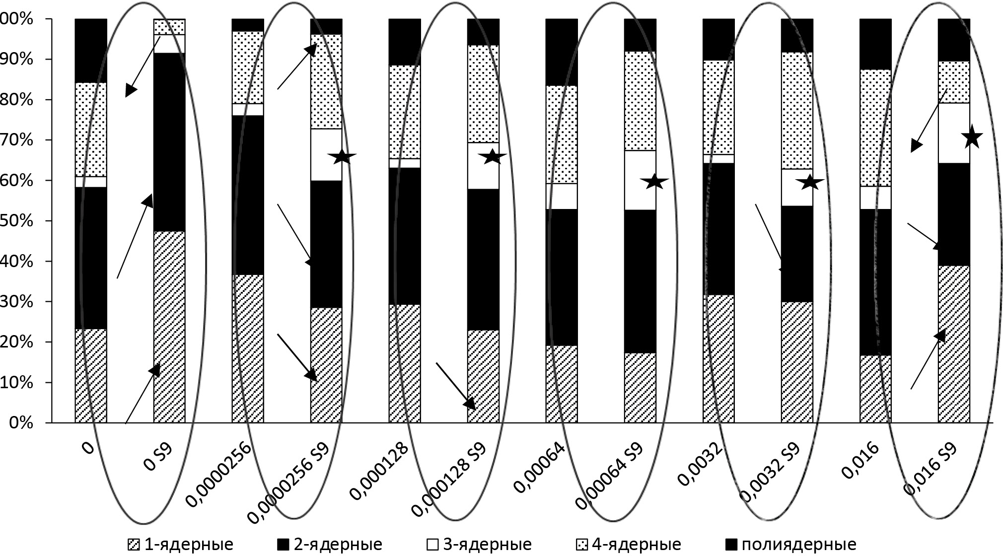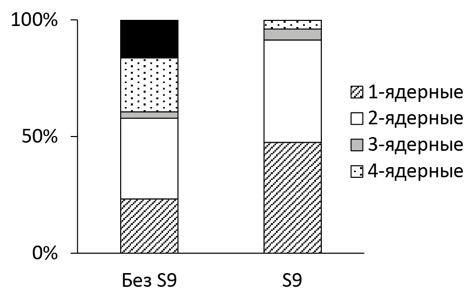 Следует понимать, что с уменьшением доли неделящихся 1-ядерных клеток в культуре увеличивается число клеток, вступивших в митоз и прошедших за время культивирования более 1 цикла деления (содержат более 2 ядер). При каждом последующем делении в клетках выявляется всё больше скрытых генетических повреждений, проявляющиеся в виде микроядер и НПМ. Чем больше циклов деления прошли клетки в присутствии цитохалазина В, тем выше вероятность появления таких повреждений. На основании учёта всех клеточных популяций в культурах без фракции S9 мы подсчитали общее количество клеток с микроядрами и НПМ и сравнили с соответствующими значениями в культурах с метаболической активацией. Статистический анализ, выполненный с помощью критерия Манна–Уитни, показал статистически значимые различия между дозовыми кривыми (р=0,008).