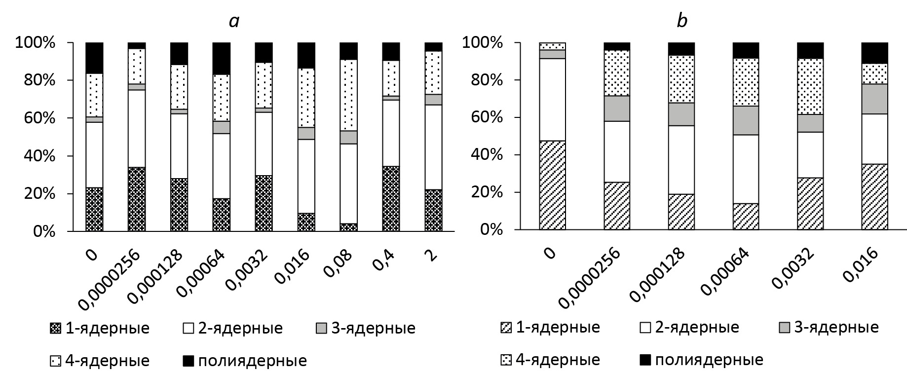 Процессы пролиферации при культивировании в условиях блока цитокинеза характеризуются распределением клеток с различным количеством ядер в спектре клеточных популяций (рис. 1). Влияние метаболической активации на продолжительность клеточного цикла проявляется в значительном увеличении доли 1- и 2-ядерных клеток, а также в снижении численности клеток, прошедших более одного цикла деления в присутствии цитохалазина B (см. рис. 1). Все полученные результаты свидетельствуют о том, что в условиях метаболической активации по сравнению с культурами без неё наблюдали торможение пролиферации клеток. Анализ спектра клеточных популяций в культурах без добавления фракции S9 (рис. 2, а) показал, что воздействие минимальных концентраций понсо 4R сопровождалось торможением пролиферации клеток, что подтверждено статистически значимым увеличением доли неделящихся 1-ядерных клеток (р <0,001) и клеток, прошедших один митотический цикл (2-ядерных, р <0,001) по сравнению с контролем. Одновременно отмечено уменьшение доли клеток, завершивших два и более цикла в присутствии цитохалазина В (многоядерные клетки с числом ядер ≥3). При повышении концентрации красителя до 0,08 мг/мл наблюдали ускорение пролиферации, сопровождающееся снижением доли неделящихся клеток и увеличением клеток, завершивших один и более циклов деления (р <0,001) после введения цитохалазина В. Особого внимания заслуживает увеличение численности 3-ядерных клеток, которое может свидетельствовать о возникновении анеуплоидии (р <0,001). В условиях метаболической активации краситель в концентрациях выше 0,08 мг/мл тормозил процессы пролиферации, что можно трактовать как токсический эффект. Выявленное на высоких концентрациях красителя увеличение частоты полиядерных клеток с микроядрами и НПМ в сочетании с признаками торможения пролиферации позволяет предположить подавление репаративных процессов. Анализ спектра клеточных популяций в культурах, содержащих фракцию S9 и различные концентрации красителя (см. рис. 2, b), показал статистически значимое снижение доли 1- и 2-ядерных клеток по сравнению с контролем с фракцией S9 (p <0,02). При этом для фракции 1-ядерных клеток выявлена чёткая U-образная зависимость от дозы: при низких концентрациях 0,000 025 6–0,000 64 мг/мл наблюдали ускорение пролиферации, а при более высоких — её угнетение. Кроме того, при воздействии концентраций красителя, не подавляющих пролиферацию, наблюдали статистически значимое увеличение доли ускоренно делящихся клеток (3-, 4- и полиядерных) по сравнению с контролем с добавлением фракции S9 (p <0,001). Особое интерес представляет увеличение численности фракции анеуплоидных 3-ядерных клеток — феномена, возникающего не только in vitro и ex vivo, но и также при обследовании людей, подвергшихся воздействию генотоксикантов [26, 27].