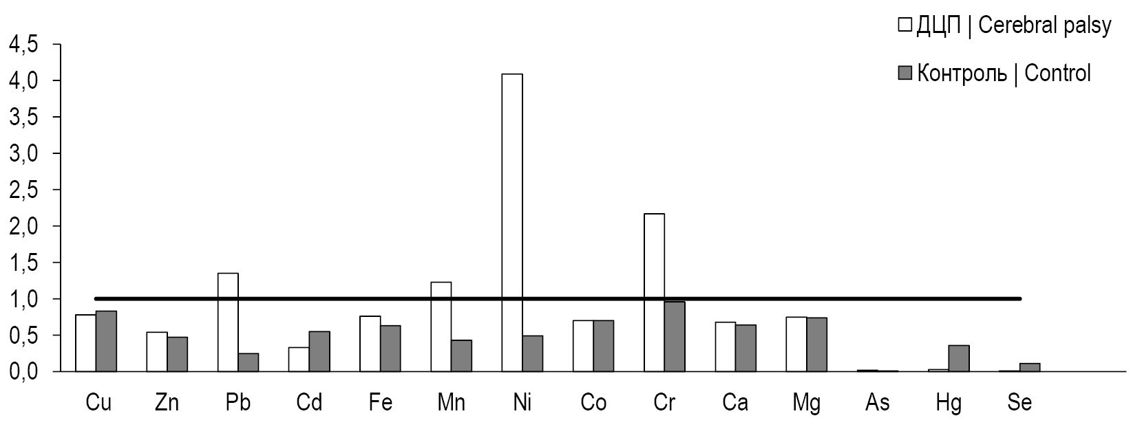 Результаты исследований содержания химических элементов в волосах детей с установленным диагнозом «ДЦП (спастическая диплегия)» в связи с отсутствием утверждённых норм оценивали относительно референтных значений, предложенных А.В. Скальным [18]. Так как для различных регионов характерен специфический фоновый уровень металлов в биосредах [6, 9, 19], концентрации металлов в волосах детей также сравнивали с уровнем в контрольной группе.