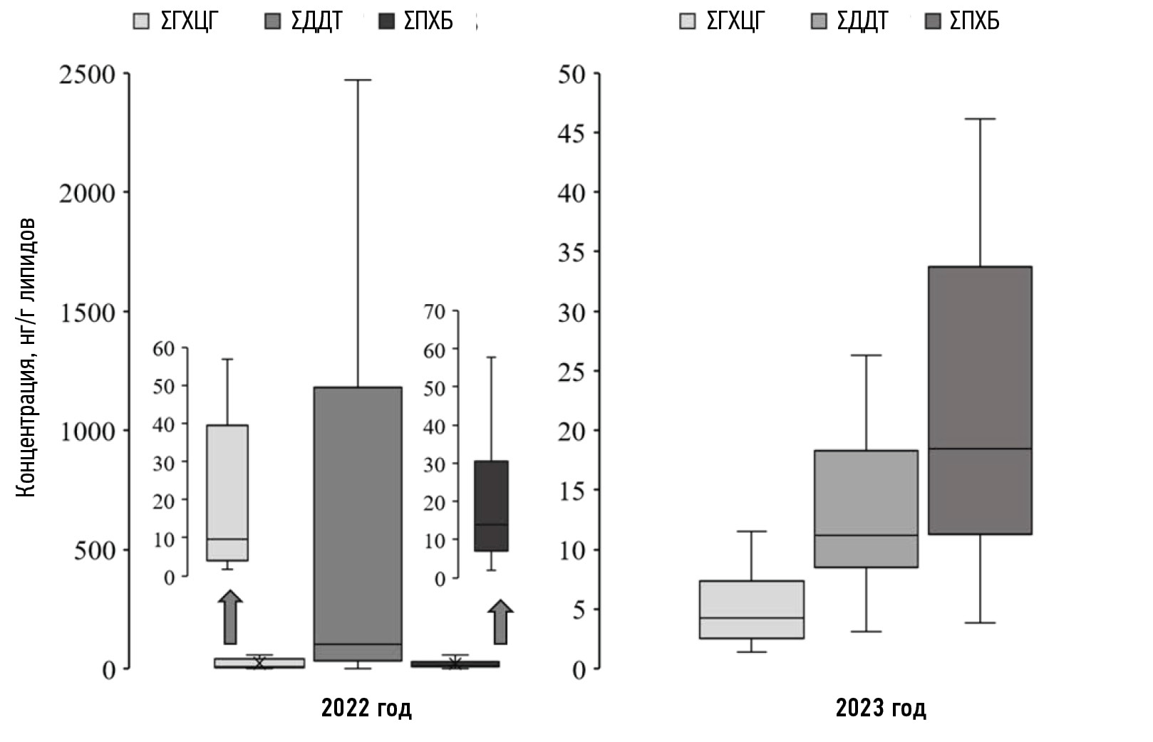 - δ-ГХЦГ обнаружен в одной пробе — 2,4 нг/г липидов.