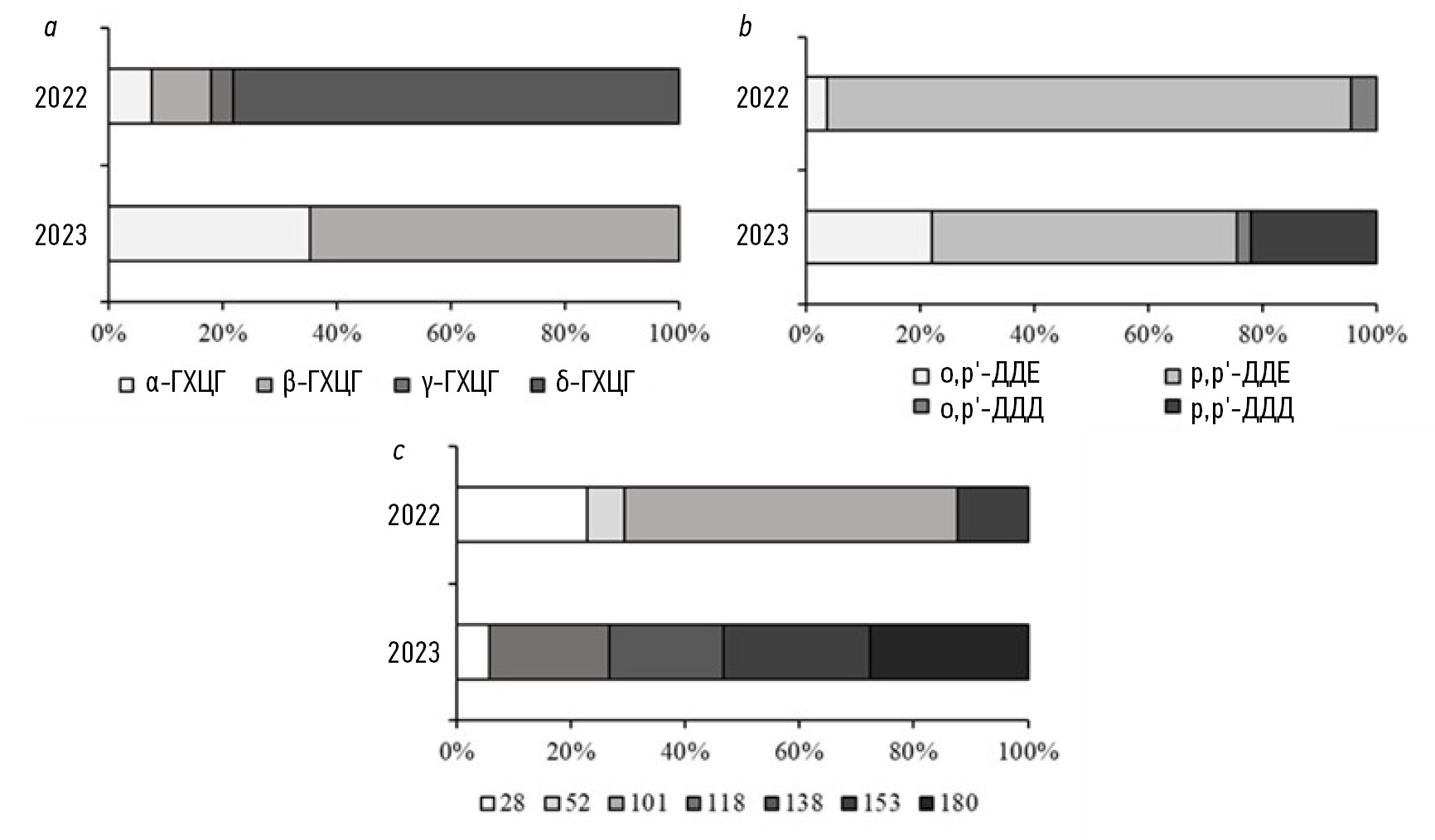 Концентрации СОЗ (∑ГХЦГ+∑ДДТ+∑ПХБ) в образцах грудного молока варьировали от 11 до 2553 нг/г липидов (Me 182). Содержание ХОП [∑ изомеров ГХЦГ (α, β, γ, δ), ДДТ и его метаболитов (o.p’-ДДТ, p.p’-ДДТ, o.p’-ДДД, p.p’-ДДД, o.p’-ДДЕ, p.p’-ДДЕ)] находилось в диапазоне 3–2524 нг/г липидов (Me 182). Концентрации конгенеров ПХБ (28, 52, 101, 118, 153, 138, 180) составляли 2–58 нг/г липидов (Me 14). Концентрации ∑ГХЦГ и ∑ДДТ варьировали от 2 до 1071 (Me 10) и от 2 и 2470 нг/г липидов (Me 102) соответственно. Изомеры ГХЦГ обнаружены в 81% проб, при этом наиболее часто встречали β-ГХЦГ (73%). Концентрации отдельных изомеров составили: