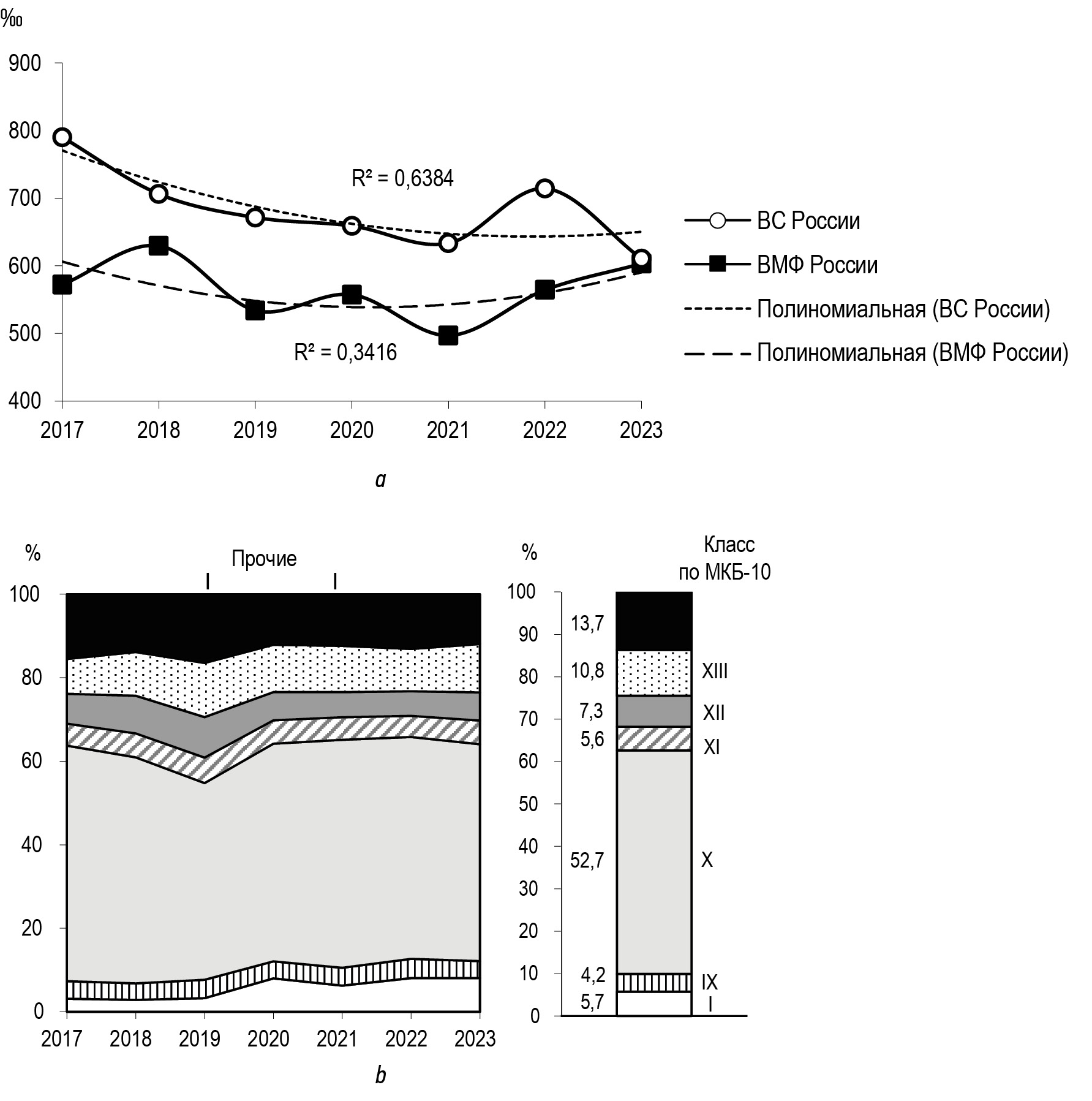 AIM: The work aimed to present the trends and structure of primary morbidity among Russian Navy service members over a 7-year period (2017–2023).