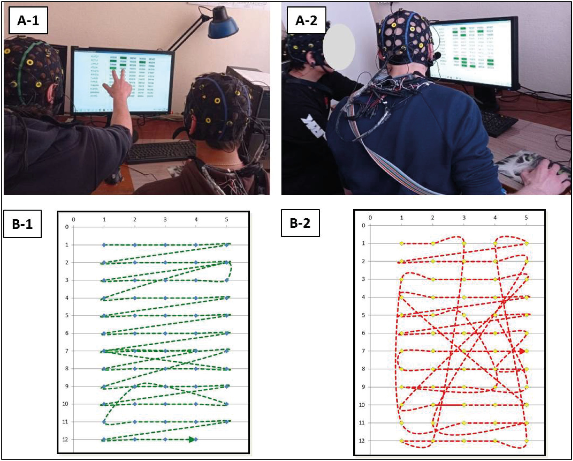 2. Fig. 1. Illustrations of the Pattern Recognition Test Performance: Photographs of partners employing joint (A-1) and separate (A-2) cooperation strategies; graphs of sequential mouse clicks in the two-dimensional matrix space of the test under joint (B-1) and separate (B-2) cooperation strategies. The x-axis shows the numbers of digit groups in rows; the y-axis shows the row numbers in the matrix; dashed lines represent the trajectories of transitions between digit groups, and arrows indicate the point at which the test was completed.