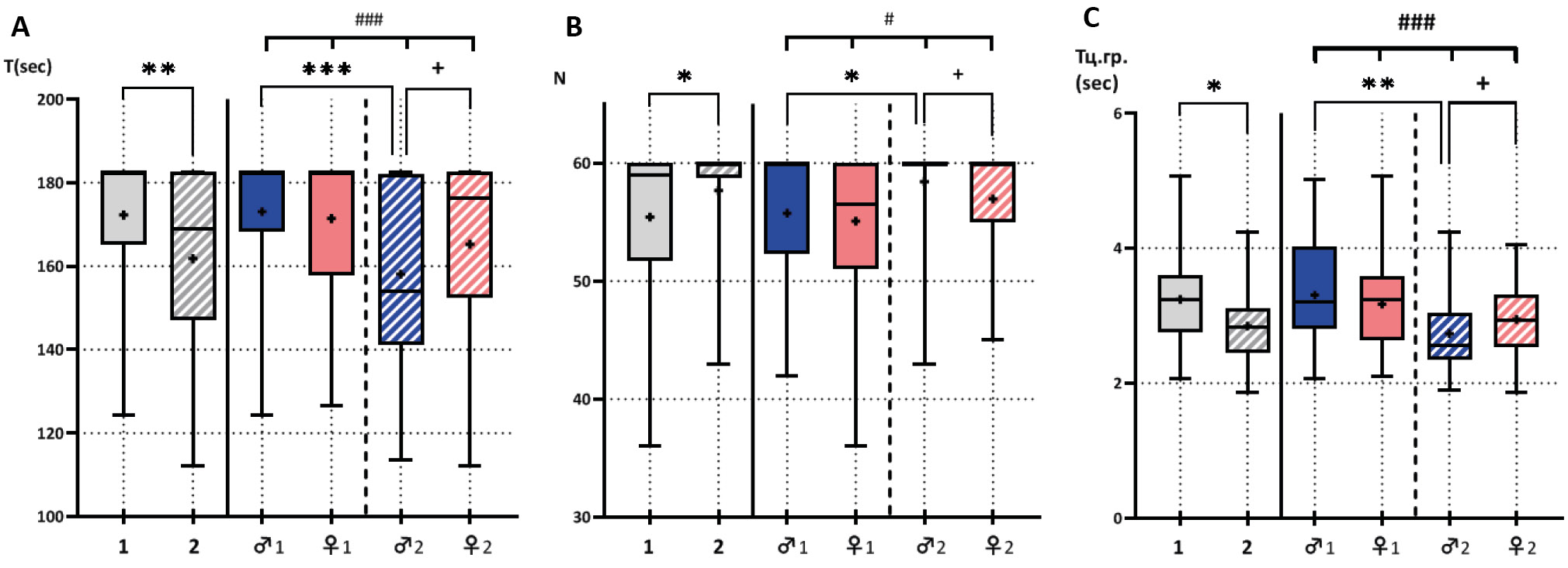 Fig. 2. Diagrams of cooperative performance indicators in participant dyads: A, total time to complete the Pattern Recognition Test; B, total number of identified digit combinations; C, average duration of digit group analysis. On the x-axis comparison groups: 1 and 2 represent all dyads with different cooperation strategies; ♂1, ♂2, ♀1, ♀2 represent male and female dyads with different strategies. On the y-axis: scales of the indicators. Lines inside the boxes represent medians; box edges correspond to Q1 and Q3 quartiles; whiskers indicate minimum and maximum values; crosses inside the boxes denote means. Statistical significance: * between cooperation strategies (Mann–Whitney test), + between sexes (Mann–Whitney test), # across all four groups (Kruskal–Wallis test). The number of symbols corresponds to levels of significance: p < 0.05, p < 0.01, p < 0.001.