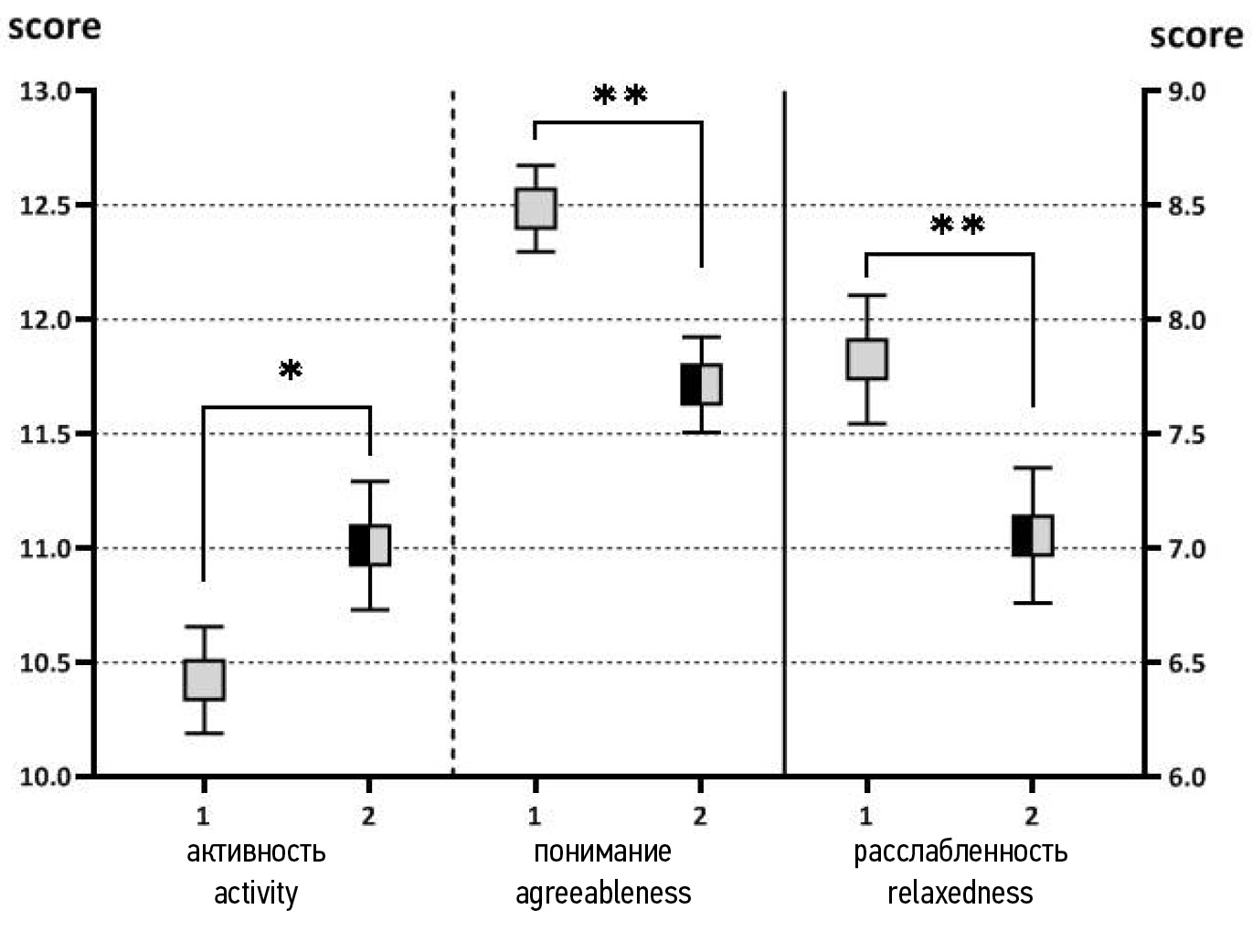 4. Fig. 3. Levels of personality traits in participants with joint (1) and separate (2) strategies of subsequent cooperation in dyads. Mean values with standard errors are presented for each group; the significance of intergroup differences is indicated as follows: * p < 0.1, ** p < 0.05.