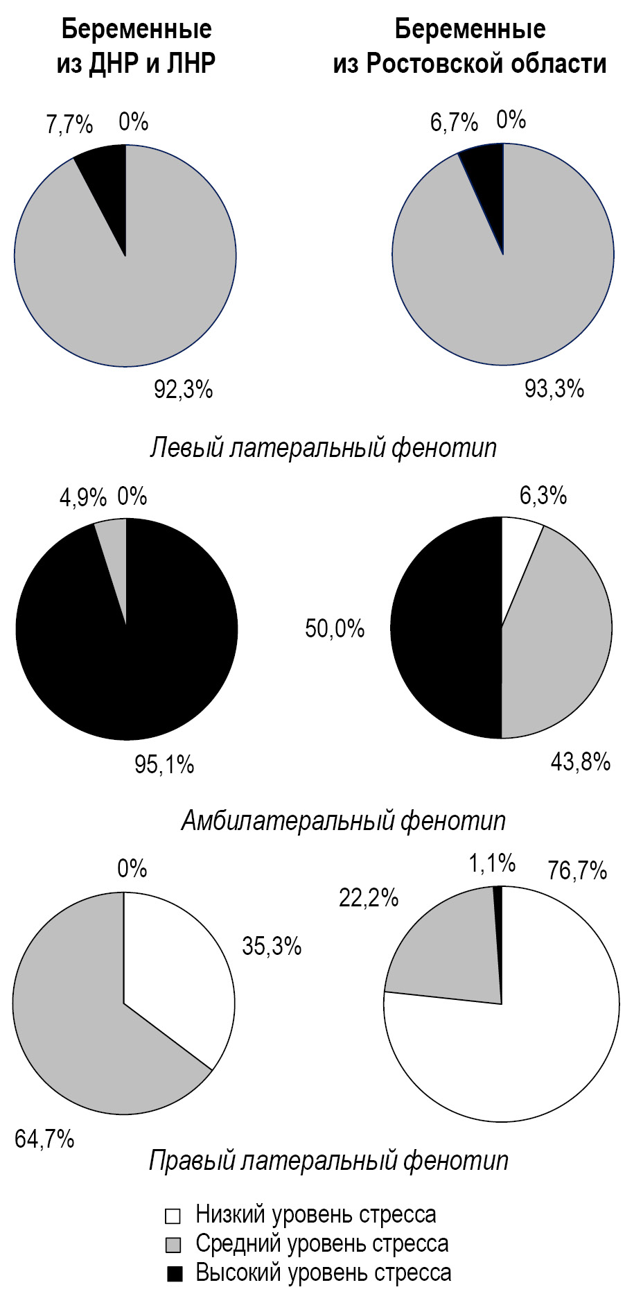 По результатам тестирования по М. Аннет в 1-й группе доминировали беременные с АЛФ (162 женщины), тогда как полярные (правый и левый фенотипы) были представлены значимо меньшим числом беременных (13 и 17 женщин соответственно). Напротив, в группе сравнения (2-я группа) у беременных преобладал ПЛФ (90 обследованных) по сравнению с АЛФ (48 обследованных) и ЛЛФ (15 обследованных). Затем определяли частоту обнаружения различных уровней стресса у беременных из Ростовской области, ДНР и ЛНР в зависимости от характера ЛФ (рис. 1). Было обнаружено, что средний уровень стресса, независимо от региона проживания, доминировал у беременных с ЛЛФ: 12/13 (92%) в 1-й группе по сравнению с 14/15 (93%) во 2-й группе; р=0,921. У беременных с АЛФ преобладал высокий уровень стресса в обоих регионах проживания, но в 1-й группе этот показатель был статистически значимо (в 1,8 раза) выше [154/162 (95%) по сравнению с 24/48 (50%) во 2-й группе (р=0,0001)]. У беременных с ПЛФ низкий уровень стресса регистрировался значимо чаще во 2-й группе — 69/90 (77%) по сравнению с 6/17 (35%) в 1-й группе (р=0,0005). В то же время в 1-й группе преобладал средний уровень стресса — 11/17 (64,7%) по сравнению с 20/90 (22,2%) во 2-й группе (р=0,041).