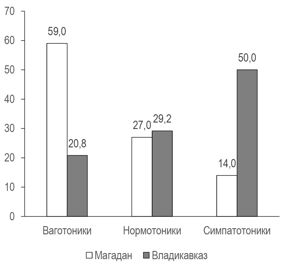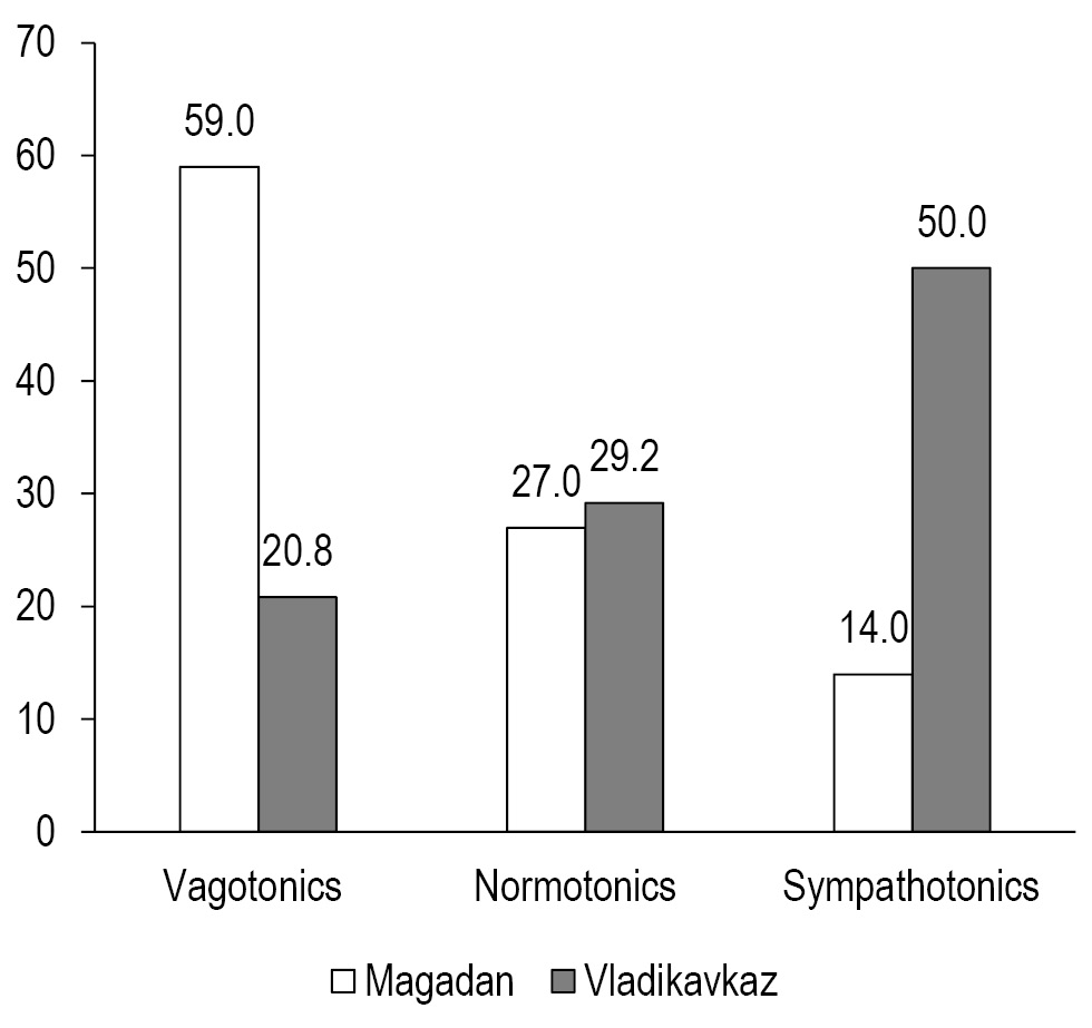 The study involved a comprehensive analysis of autonomic cardiovascular regulation based on the HRV time and frequency domains in groups of young men from different regions, including northeast Russia (Magadan) and the North Caucasus (Vladikavkaz, Republic of North Ossetia-Alania). The distribution of types of autonomic heart rate regulation in young men living in different environment and climate with significant gradients of meteorological parameters and altitude above sea level is shown in Fig. 1. It is evident that among natives of the northeast, the share of vagotonic individuals is 59.0%, the share of normotonic individuals is 27.0%, and the share of sympathotonic individuals is 14.0%. On the contrary, the share of vagotonic individuals among natives of the North Caucasus is 20.8%, the share of normotonic individuals is 29.2%, and the share of sympathotonic individuals is 50.0%.