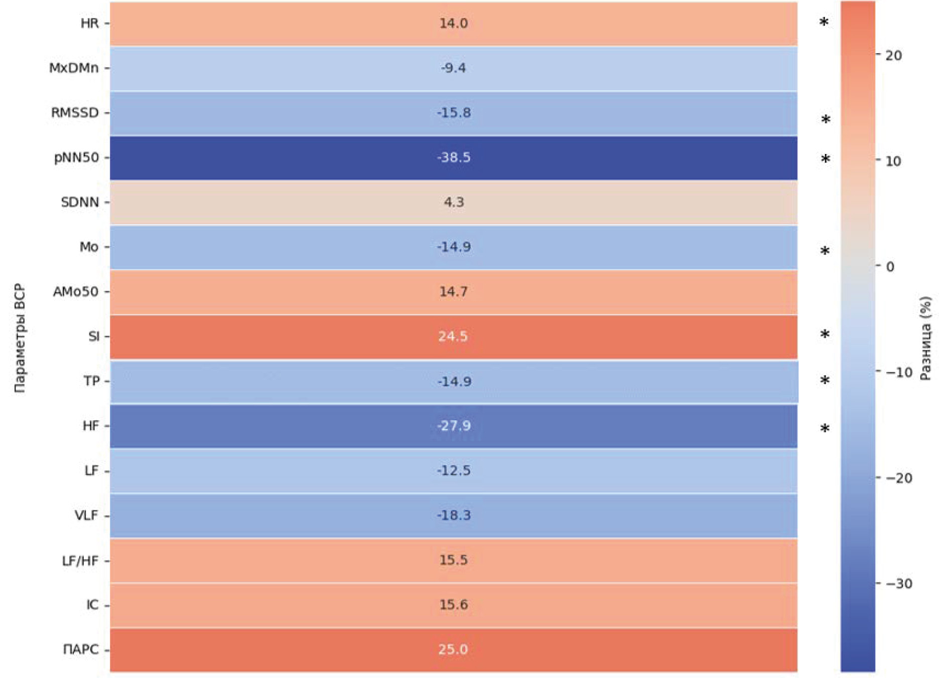 Fig. 2. Intergroup differences in heart rate variability in young men of the North Caucasus and North-Eastern regions of Russia. * Statistically significant intergroup differences are indicated. Blue color range — the value is higher for representatives of the north-eastern region, red color range — the value is higher for representatives of the North Caucasus.
