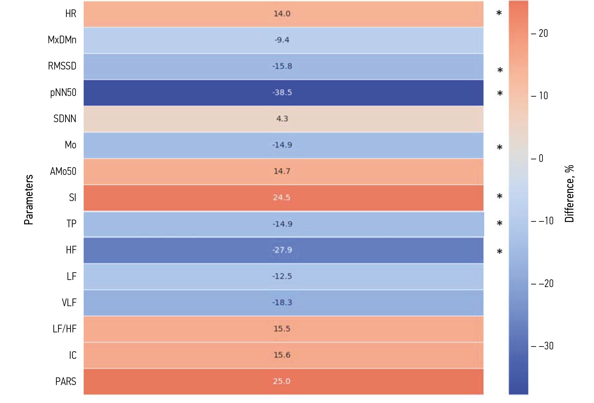Note. HR is the heart rate; MxDMn is the difference between the maximum and minimum values of the cardiointervals, or the variation range; RMSSD is the square root of the sum of the differences in a consecutive series of cardiointervals; pNN50 is the number of pairs of cardiointervals with a difference of more than 50 ms, % of the total number of cardiointervals; SDNN is the standard deviation of the full array of cardiointervals; Mo is the mode; AMo is the amplitude of the mode; SI is the stress index (voltage index of regulatory systems); TP is the total power of the spectrum of time values of R-R heart rate intervals.; HF is the spectral power of the high–frequency component of heart rate variability in the range of 0.4–0.15 Hz (respiratory waves); LF is the spectral power of the low–frequency component of heart rate variability in the range of 0.15–0.04 Hz (vascular waves); VLF is the spectral power of the very low–frequency component of heart rate variability in the range of 0.04-0.015 Hz;. LF/HF is an indicator of sympathovagal balance; IC is an index of centralization, PARS is an indicator of the activity of regulatory systems; p is the level of statistical significance.