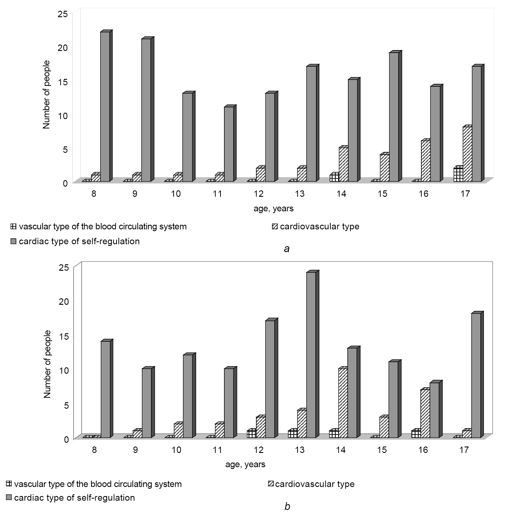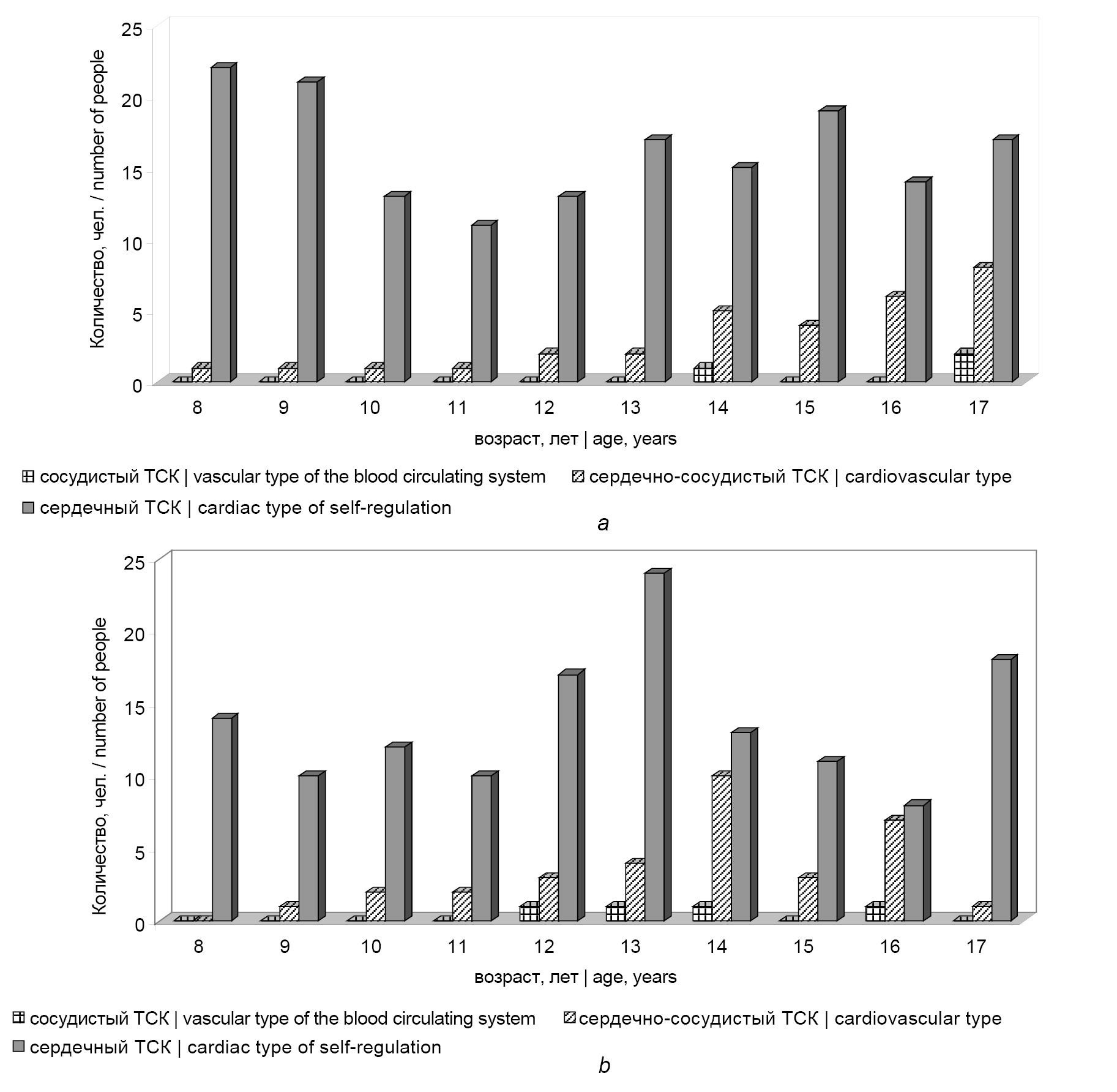 In the age-related pattern, only boys demonstrated a trend toward an increasing proportion of schoolchildren with cardiovascular TCA, which is consistent with findings from studies of European-descendant boys [23]. Among 8- to 16-year-old girls, the prevalence of cardiac and cardiovascular TCA followed an inverted U-shaped pattern (Fig. 1, b). While the peak frequency of the cardiac type of TCA in 12- to 13-year-old girls is likely associated with intensive somatic changes and immature mechanisms of circulatory regulation, by age 17 this functional pattern may indicate maladaptive responses. The observed distribution of cardiac and cardiovascular TCA types in girls may be explained by the fact that early pubertal somatic maturation is accompanied by a more prolonged phase of functional development of the circulatory system. Therefore, their adaptive capacity may require greater mobilization of functional reserves compared to boys.